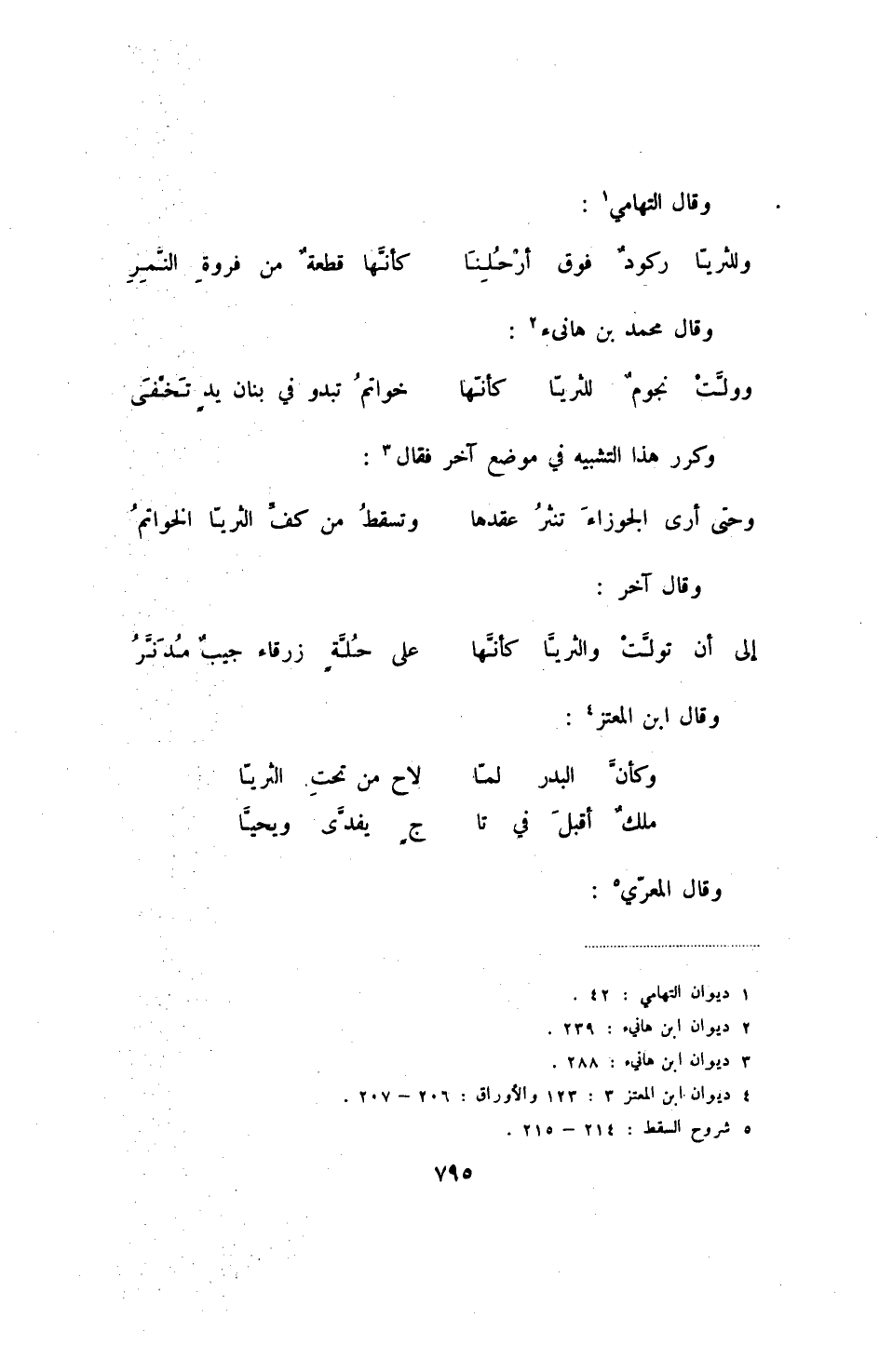وولت نجوم للثريا كأنها ... خواتم تبدو في بنان يدٍ تخفى وكرر هذا التشبيه في موضع آخر فقال (3) :