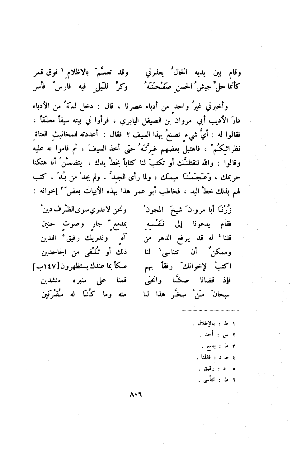 كأنما حل جيش الحسن صفحته ... وكر لليل فيه فارس فأسر وأخبرني غير واحدٍ من أدباء عصرنا، قال: دخل لمة من الأدباء دار الأديب أبي مروان بن الصقيل اليابري، فرأوا في بيته سيفاً معلقاً، فقالوا له: أي شيء تصنع بهذا السيف - فقال: أعددته للمخانيث العتاة نظرائكم، فاهتبل بعضهم غرته حتى أهذ السيف، ثم قاموا به عليه وقال: والله لنقتلنك أو تكتب لنا كتاباً بخط يدك، يتضمن أنا هتكنا حريمك، وعجمنا ميمك؛ ولما رأى الجد، ولم يجد من بد، كتب لهم بذلك خط اليد، فخاطب أبو عمر هذا بهذه الأبيات بعض (2) إخوانه: