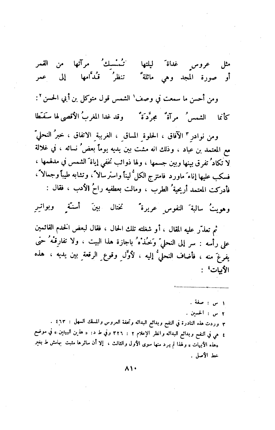 كأنما الشمس مرآة مجردة ... وقد غدا المغرب الأقصى لها سفطا ومن نوادر (3) الآفاق، الحلوة المساق، الغريبة الاتفاق، خبر النحلي مع المعتمد بن عباد، وذلك أنه مشت بين يديه يوماً بعض نسائه، في غلالة لا تكاد تفرق بينها وبين جسمها، ولها ذوائب تخفي إياة الشمس في مدلهما، فسكب عليها إناء ماورد فامتزج الكل ليناً واسترسالاً، وتشابه طيباً وجمالاً، فأدركت المعتمد أريحية الطرب، ومالت بعطفيه راح الأدب، فقال:
