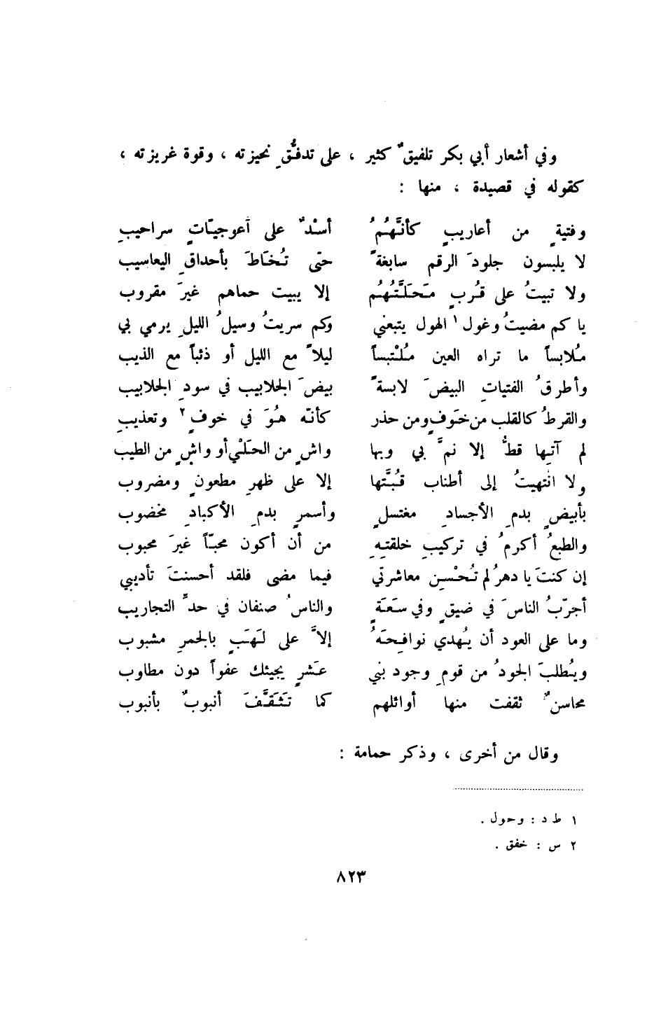 وفي أشعار أبي بكر تلفيق كثير، على تدفق نحيوته، وقوة غريزته، كقوله في قصيدة، منها: