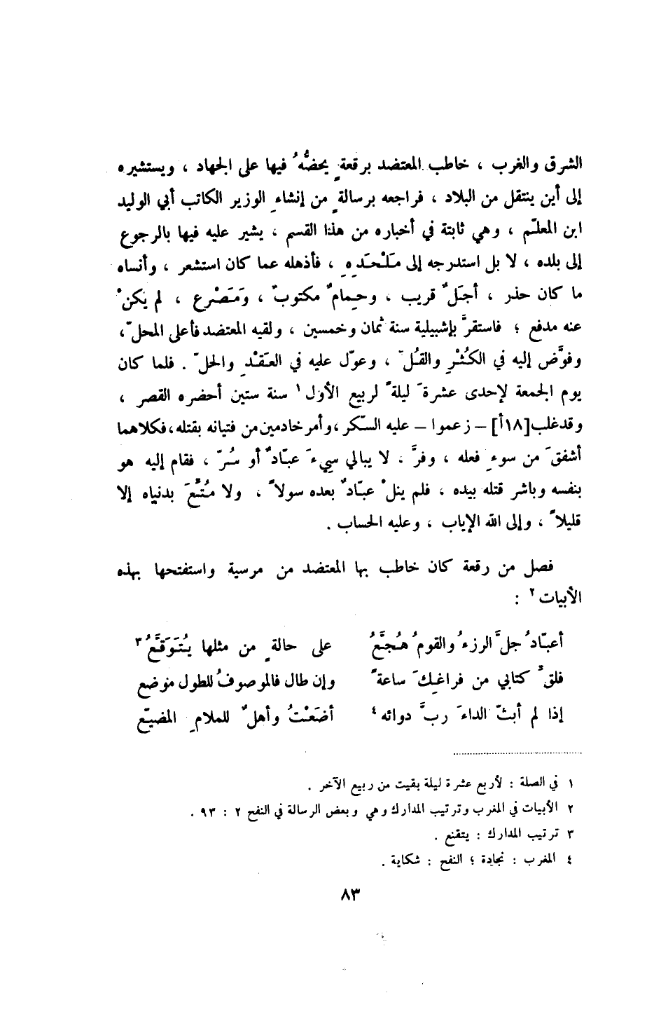 الشرق والغرب، خاطب المعتضد برقعة يحضه فيها على الجهاد، ويستشيره إلى أين ينتقل من البلاد، فراجعه برسالة من إنشاء الوزير الكاتب أبي الوليد ابن المعلم، وهي ثابتة في أخباره من هذا القسم، يشير عليه فيها بالرجوع إلى بلداه، لا بل استدرجه إلى ملحده، فأذهله عما كان استشعر، وأنساه ما كان حذر، أجل قريب، وحمام مكتوب، ومصرع، لم يكن عنه مدفع؛ فاستقر بإشبيلية سنة ثمان وخمسين، ولقيه المعتضد فأعلى المحل، وفوض إليه في الكثر والقل، وعول عليه في العقد والحل. فلما كان يوم الجمعة لإحدى عشرة ليلة لربيع الأول سنة ستين أحضره القصر، وقد غلب [18أ]- زعموا - عليه السكر، وأمر خادمين من فتيانه بقتله، فكلاهما أشفق من سوء فعله، وفر، لا يبالي سيء عباد أو سر، فقام إليه هو بنفسه وباشر قتله بيده، فلم ينل عباد بعده سولاً، ولا متع بدنياه إلا قليلاً، وإلى الله الإياب، وعليه الحساب.