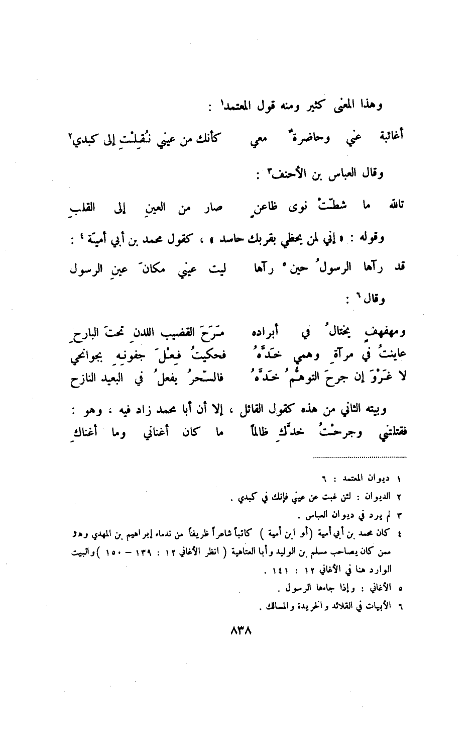 (4) كان محمد بن أبي أمية (أو ابن أمية) كاتباً شاعراً ظريفاً من ندماء إبراهيم بن المهدي وهو ممن كان يصاحب مسلم بن الوليد وأبا العتاهية (انظر الأغاني 12: 139 - 150) والبيت الوارد هنا في الأغاني 12: 141.