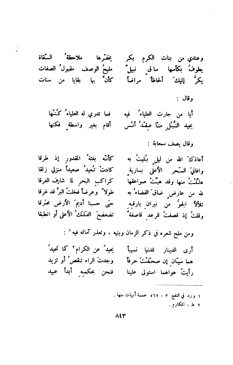 وقلت إذ قصفت للرعد قاصفة ... تضعضع الفلك الأعلى أو انطبقا ومن ملح شعره في ذكر الزمان وبنيه، وتعذر آماله فيه (1) :