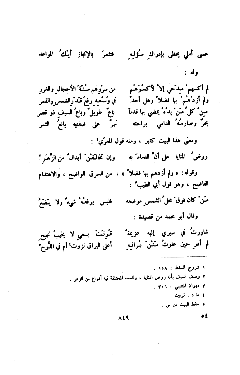 روض المنايا على أن الدماء به ... (2) وإن تخالفن أبدال من الزهر وقوله: " ولم أزدهم بها فضلاً "، من السرق الواضح، والاهتدام الفاضح، وهو قول أبي الطيب (3) :