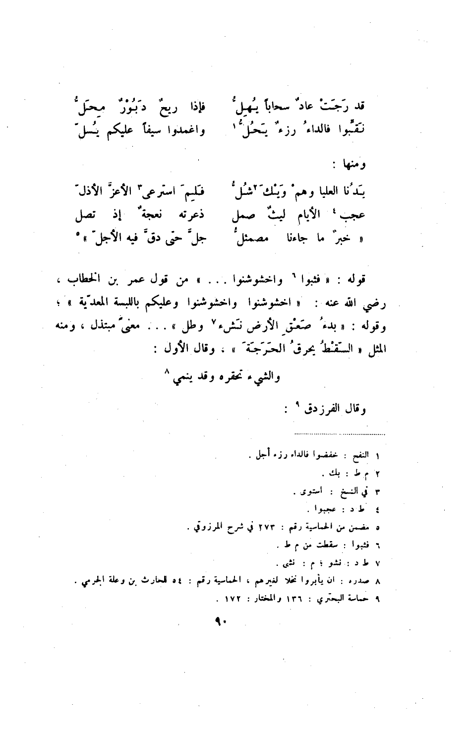 " خبر ما جاءنا مصمئل ... جل حتى دق فيه الأجل " قوله: " فثبوا واخشوشنوا ... " من قول عمر بن الخطاب، رضي الله عنه: " اخشوشنوا واخشوشنوا وعليكم باللبسة المعدية "؛ وقوله: " بدء صعق الأرض نشء وطل " ... معنى مبتذل، ومنه المثل " السقط يحرق الحرجة "، وقال الأول: