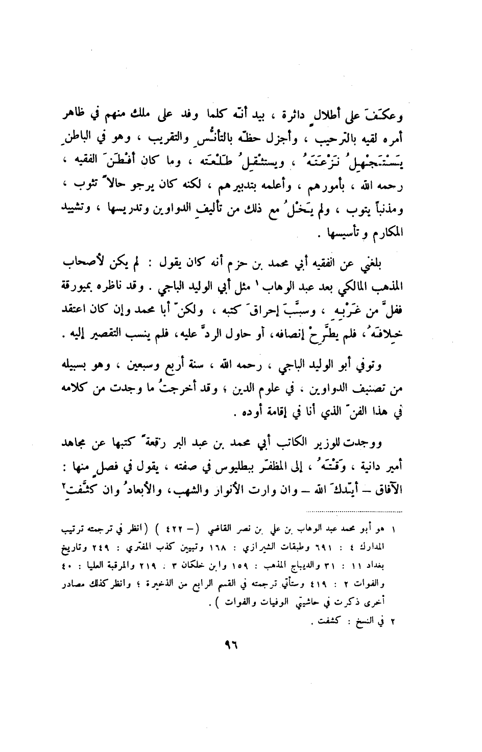 وتوفي أبو الوليد الباجي، رحمه الله، سنة أربع وسبعين، وهو بسبيله من تصنيف الدواوين، في علوم الدين؛ وقد أخرجت ما وجدت من كلامه في هذا الفن الذي أنا في إقامة أوده.