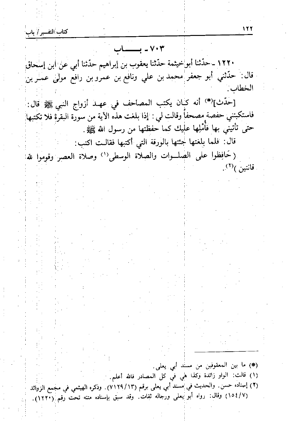 1220 - حَدَّثَنَا أَبُو خَيْثَمَةَ، حَدَّثَنَا يَعْقُوبُ بْنُ إِبْرَاهِيمَ، حَدَّثَنَا أَبِي، عَنِ ابْنِ إِسْحَاقَ قَالَ: حَدَّثَنِي أَبُو جَعْفَرٍ مُحَمَّدُ بْنُ عَلِيٍّ وَنَافِعُ بْنُ عَمْرِو بْنِ رَافِعٍ مَوْلَى عُمَرَ بْنِ الْخَطَّابِ.