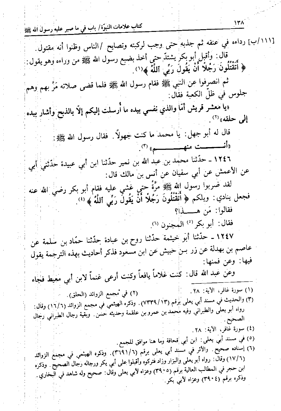 1246 - حَدَّثَنَا مُحَمَّدُ بْنُ عَبْدِ اللَّهِ بْنِ نُمَيْرٍ، حَدَّثَنَا ابْنُ أَبِي عُبَيْدَةَ، حَدَّثَنِي أَبِي، عَنِ الأَعْمَشِ، عَنْ أَبِي سُفْيَانَ، عَنْ أَنَسِ بْنِ مَالِكٍ قَالَ: لَقَدْ ضَرَبُوا رَسُولَ اللَّهِ صَلَّى اللَّهُ عَلَيْهِ وَسَلَّمَ مَرَّةً حَتَّى غُشِيَ عَلَيْهِ فَقَامَ أَبُو بَكْرٍ رَضِيَ اللَّهُ عَنْهُ فَجَعَلَ يُنَادِي: وَيْلُكُمْ {أَتَقْتُلُونَ رَجُلا أَنْ يَقُولَ رَبِّيَ اللَّهُ} [غافر: 28] .