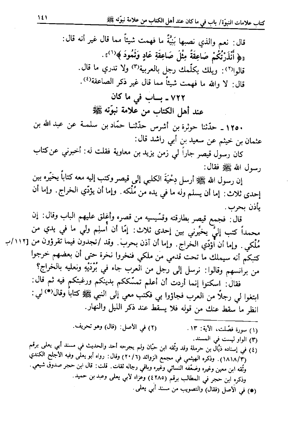 1250 - حَدَّثَنَا حَوْثَرَةُ بْنُ أَشْرَسَ، حَدَّثَنَا حَمَّادُ بْنُ سَلَمَةَ، عَنْ عَبْدِ اللَّهِ بْنِ عُثْمَانَ بْنِ خَيْثَمَ، عَنْ سَعِيدِ بْنِ أَبِي رَاشِدٍ قَالَ: كَانَ رَسُولُ قَيْصَرَ جَارًا لِي زَمَنَ يَزِيدَ بْنِ مُعَاوِيَةَ فَقُلْتُ لَهُ: أَخْبِرْنِي عَنْ كِتَابِ رَسُولِ اللَّهِ صَلَّى اللَّهُ عَلَيْهِ وَسَلَّمَ فَقَالَ: إِنَّ رَسُولَ اللَّهِ صَلَّى اللَّهُ عَلَيْهِ وَسَلَّمَ أَرْسَلَ دِحْيَةَ الْكَلْبِيَّ إِلَى قَيْصَرَ وَكَتَبَ إِلَيْهِ مَعَهُ كِتَابًا يُخَيِّرُهُ بَيْنَ إِحْدَى ثَلاثٍ: إِمَّا أَنْ يُسْلِمَ وَلَهُ مَا فِي يَدِهِ مِنْ مُلْكِهِ.