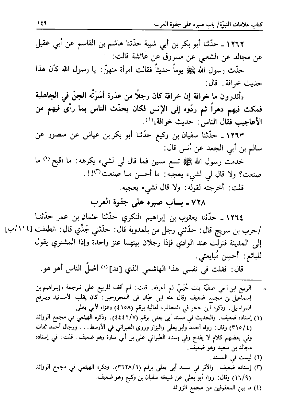 1262 - حَدَّثَنَا أَبُو بَكْرِ بْنُ أَبِي شَيْبَةَ، حَدَّثَنَا هَاشِمُ بْنُ الْقَاسِمِ، عَنْ أَبِي عَقِيلٍ، عَنْ مُجَالِدٍ، عَنِ الشَّعْبِيِّ، عَنْ مَسْرُوقٍ، عَنْ عَائِشَةَ قَالَتْ: حَدَّثَ رَسُولُ اللَّهِ صَلَّى اللَّهُ عَلَيْهِ وَسَلَّمَ يَوْمًا حَدِيثًا فَقَالَتِ امْرَأَةٌ مِنْهُنَّ: يَا رَسُولَ اللَّهِ كَأَنَّ هَذَا حَدِيثُ خُرَافَةَ.