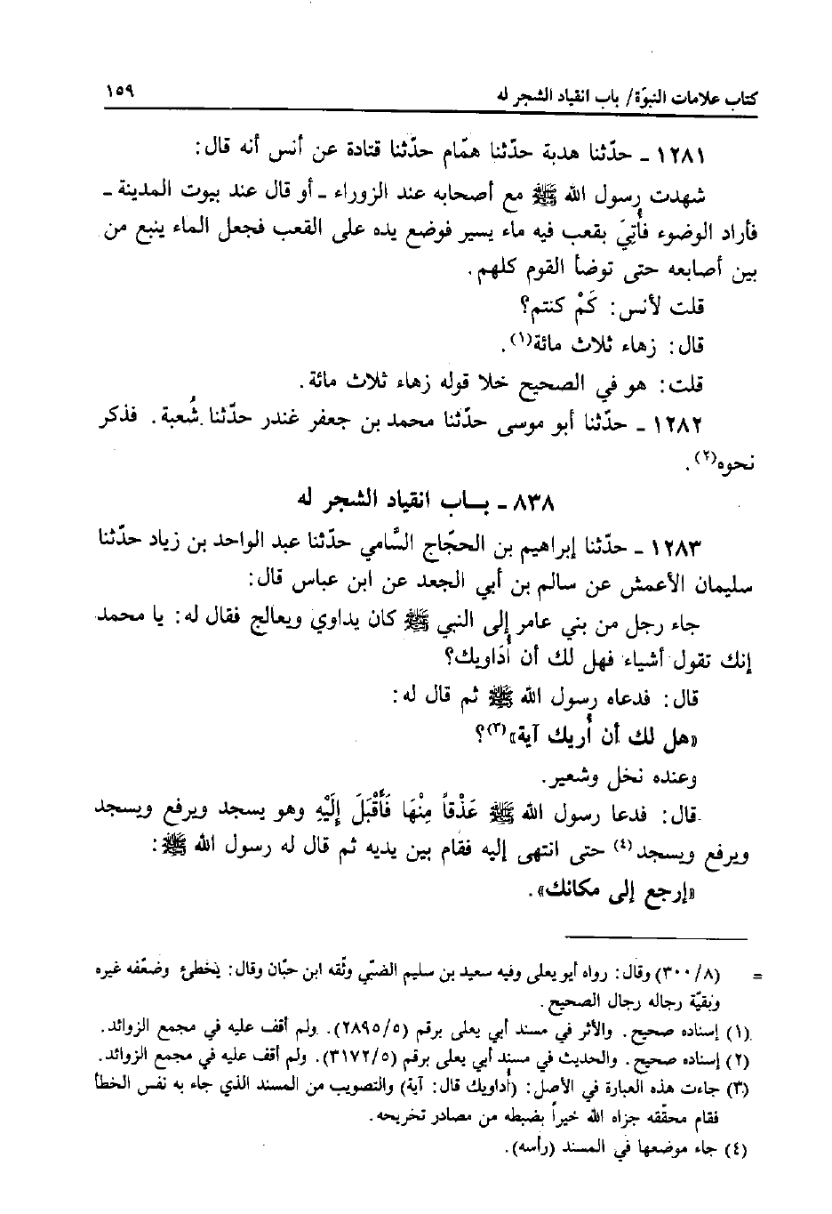 1283 - حَدَّثَنَا إِبْرَاهِيمُ بْنُ الْحَجَّاجِ السَّامِيُّ، حَدَّثَنَا عَبْدُ الْوَاحِدِ بْنُ زِيَادٍ، حَدَّثَنَا سُلَيْمَانُ الأَعْمَشُ، عَنْ سَالِمِ بْنِ أَبِي الْجَعْدِ، عَنِ ابْنِ عَبَّاسٍ قَالَ: جَاءَ رَجُلٌ مِنْ بَنِي عَامِرٍ إِلَى النَّبِيِّ صَلَّى اللَّهُ عَلَيْهِ وَسَلَّمَ كَانَ يُدَاوِي وَيُعَالِجُ فَقَالَ لَهُ: يَا مُحَمَّدُ إِنَّكَ تَقُولُ أَشْيَاءَ فَهَلْ لَكَ أَنْ أُدَاوِيكَ؟ قَالَ: فَدَعَاهُ رَسُولُ اللَّهِ صَلَّى اللَّهُ عَلَيْهِ وَسَلَّمَ ثُمَّ قَالَ لَهُ: «هَلْ لَكَ أَنْ أُرِيكَ آيَةً» ؟ وَعِنْدَهُ نَخْلٌ وَشَعِيرٌ.
