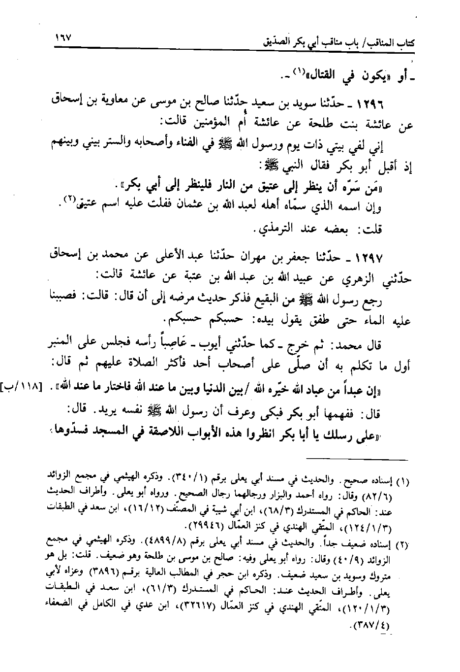 1296 - حَدَّثَنَا سُوَيْدُ بْنُ سَعِيدٍ، حَدَّثَنَا صَالِحُ بْنُ مُوسَى، عَنْ مُعَاوِيَةَ بْنِ إِسْحَاقَ، عَنْ عَائِشَةَ بِنْتِ طَلْحَةَ، عَنْ عَائِشَةَ أُمِّ الْمُؤْمِنِينَ قَالَتْ: إِنِّي لَفِي بَيْتِي ذَاتَ يَوْمٍ وَرَسُولُ اللَّهِ صَلَّى اللَّهُ عَلَيْهِ وَسَلَّمَ فِي الْفِنَاءِ وَأَصْحَابُهُ وَالسِّتْرُ بَيْنِي وَبَيْنَهُمْ إِذْ أَقْبَلَ أَبُو بَكْرٍ فَقَالَ النَّبِيُّ صَلَّى اللَّهُ عَلَيْهِ وَسَلَّمَ: «مَنْ سَرَّهُ أَنْ يَنْظُرَ إِلَى عَتِيقٍ مِنَ النَّارِ فَلْيَنْظُرْ إِلَى أَبِي بَكْرٍ» .