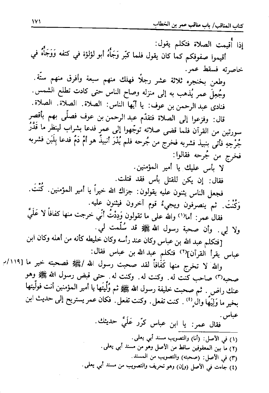 إِذَا أُقِيمَتِ الصَّلاةُ فَتَكَلَّمَ يَقُولُ: أَقِيمُوا صُفُوفَكُمْ كَمَا كَانَ يَقُولُ، فَلَمَّا كَبَّرَ وَجَأَهُ أَبُو لُؤْلُؤَةَ فِي كَتِفِهِ وَوَجَأَهُ فِي خَاصِرَتِهِ فَسَقَطَ عُمَرُ.