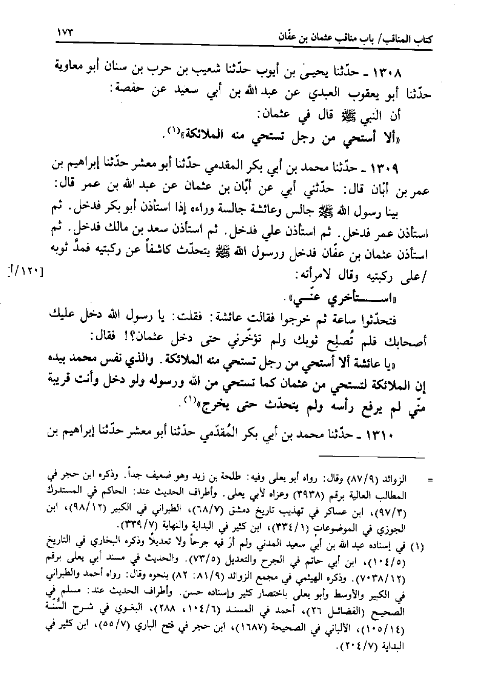 1308 - حَدَّثَنَا يَحْيَى بْنُ أَيُّوبَ، حَدَّثَنَا شُعَيْبُ بْنُ حَرْبِ بْنِ سِنَانٍ أَبُو مُعَاوِيَةَ، حَدَّثَنَا أَبُو يَعْقُوبَ الْعَبْدِيُّ، عَنْ عَبْدِ اللَّهِ بْنِ أَبِي سَعِيدٍ، عَنْ حَفْصَةَ: أَنَّ النَّبِيَّ صَلَّى اللَّهُ عَلَيْهِ وَسَلَّمَ قَالَ فِي عُثْمَانَ: «أَلا أَسْتَحِي مِنْ رَجُلٍ تَسْتَحِي مِنْهُ الْمَلائِكَةُ» .