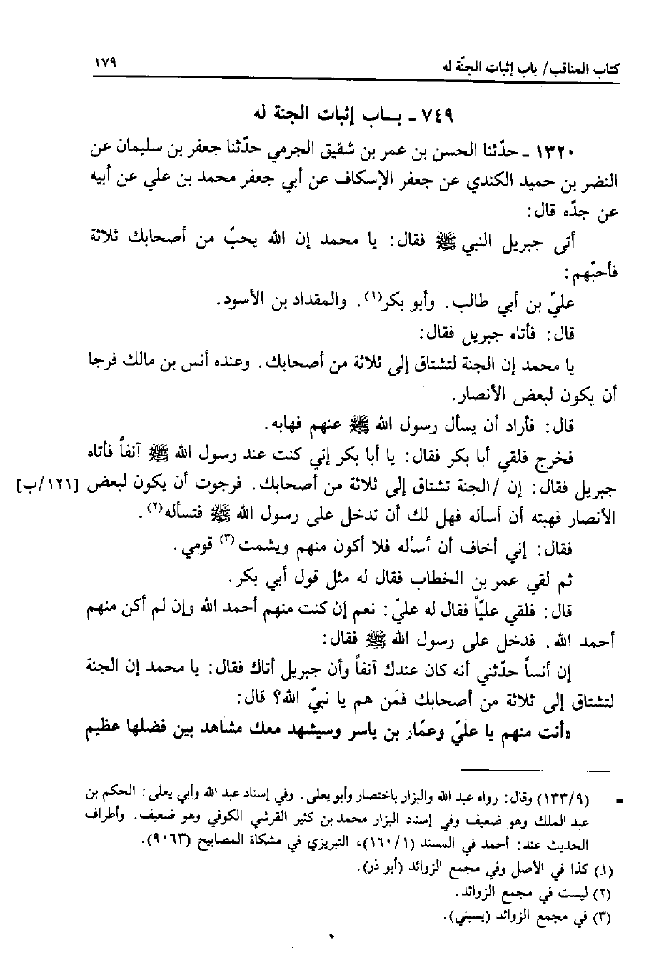 فَدَخَلَ عَلَى رَسُولِ اللَّهِ صَلَّى اللَّهُ عَلَيْهِ وَسَلَّمَ فَقَالَ: إِنَّ أَنَسًا حَدَّثَنِي أَنَّهُ كَانَ عِنْدَكَ آنِفًا وَأَنَّ جِبْرِيلَ أَتَاكَ فَقَالَ: يَا مُحَمَّدُ إِنَّ الْجَنَّةَ لَتَشْتَاقُ إِلَى ثَلاثَةٍ مِنْ أَصْحَابِكَ فَمَنْ هُمْ يَا نَبِيَّ اللَّهِ؟ قَالَ: «أَنْتَ مِنْهُمْ يَا عَلِيُّ، وَعَمَّارُ بْنُ يَاسِرٍ وَسَيَشْهَدُ مَعَكَ مَشَاهِدَ بَيْنَ فَضْلِهَا عَظِيمُ