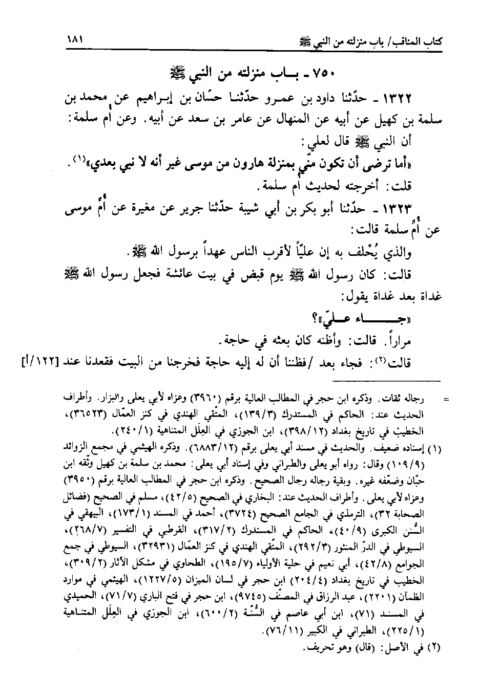 وَعَنْ أُمِّ سَلَمَةَ: أَنَّ النَّبِيَّ صَلَّى اللَّهُ عَلَيْهِ وَسَلَّمَ قَالَ لِعَلِيٍّ: «أَمَا تَرْضَى أَنْ تَكُونَ مِنِّي بِمَنْزِلَةِ هَارُونَ مِنْ مُوسَى غَيْرُ أَنَّهُ لا نَبِيَّ بَعْدِي» .
