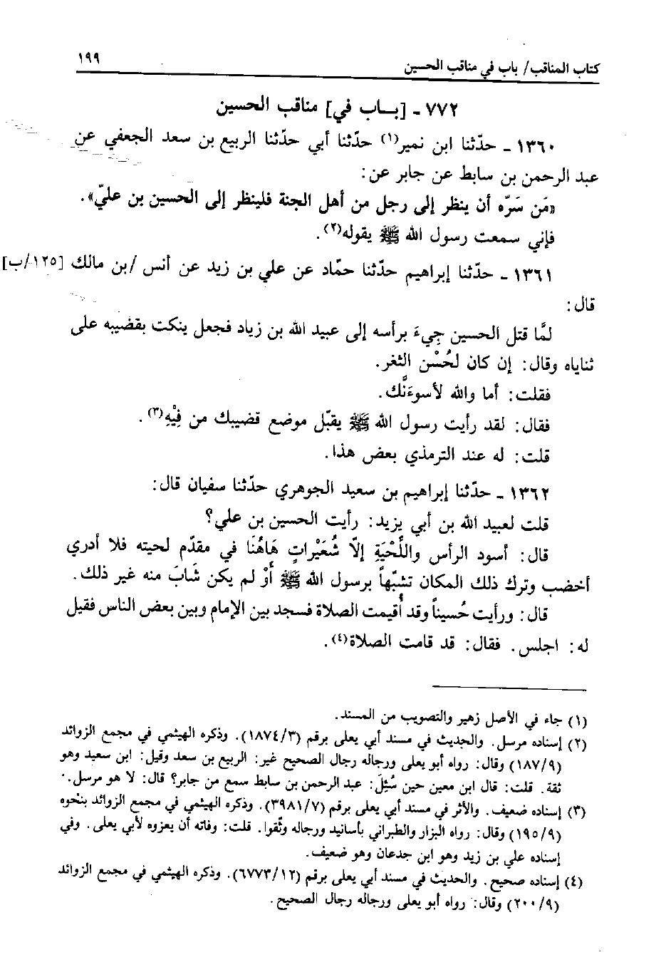 1360 - حَدَّثَنَا ابْنُ نُمَيْرٍ، حَدَّثَنَا أَبِي، حَدَّثَنَا الرَّبِيعُ بْنُ سَعْدٍ الْجُعْفِيُّ، عَنْ عَبْدِ الرَّحْمَنِ بْنِ سَابِطٍ، عَنْ جَابِرٍ، عَنْ: «مَنْ سَرَّهُ أَنْ يَنْظُرَ إِلَى رَجُلٍ مَنْ أَهْلِ الْجَنَّةِ فَلْيَنْظُرْ إِلَى الْحُسَيْنِ بْنِ عَلِيٍّ» .