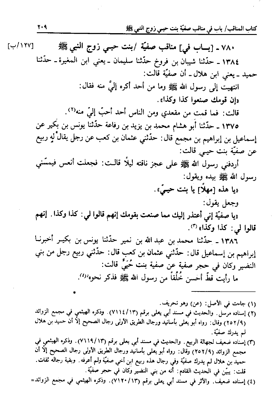 1386 - حَدَّثَنَا مُحَمَّدُ بْنُ عَبْدِ اللَّهِ بْنِ نُمَيْرٍ، حَدَّثَنَا يُونُسُ بْنُ بُكَيْرٍ، أَخْبَرَنَا إِبْرَاهِيمُ بْنُ إِسْمَاعِيلَ قَالَ: حَدَّثَنِي عُثْمَانُ بْنُ كَعْبٍ قَالَ: حَدَّثَنِي رَبِيعٌ رَجُلٌ مِنْ بَنِي النَّضِيرِ وَكَانَ فِي حِجْرِ صَفِيَّةَ، عَنْ صَفِيَّةَ بِنْتِ حَيِيٍّ قَالَتْ: مَا رَأَيْتُ قَطُّ أَحْسَنَ خُلُقًا مِنْ رَسُولِ اللَّهِ صَلَّى اللَّهُ عَلَيْهِ وَسَلَّمَ فَذَكَرَ نَحْوَهُ