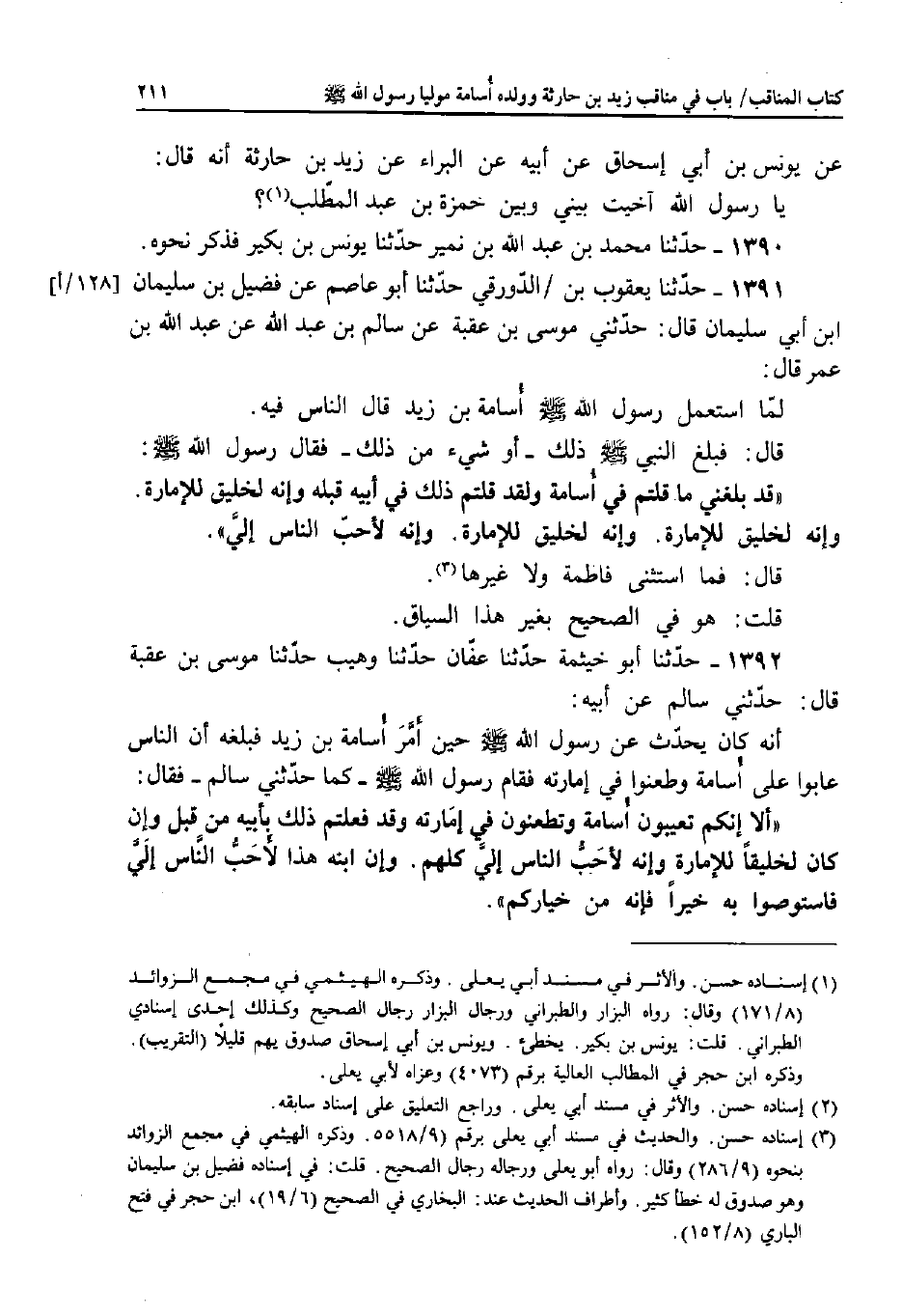 1392 - حَدَّثَنَا أَبُو خَيْثَمَةَ، حَدَّثَنَا عَفَّانُ، حَدَّثَنَا وُهَيْبٌ، حَدَّثَنَا مُوسَى بْنُ عُقْبَةَ قَالَ: حَدَّثَنِي سَالِمٌ، عَنْ أَبِيهِ: أَنَّهُ كَانَ يُحَدِّثُ عَنْ رَسُولِ اللَّهِ صَلَّى اللَّهُ عَلَيْهِ وَسَلَّمَ حِينَ أَمَّرَ أُسَامَةَ بْنَ زَيْدٍ فَبَلَغَهُ أَنَّ النَّاسَ عَابُوا عَلَى أُسَامَةَ وَطَعَنُوا فِي إِمَارَتِهِ، فَقَامَ رَسُولُ اللَّهِ صَلَّى اللَّهُ عَلَيْهِ وَسَلَّمَ - كَمَا حَدَّثَنِي سَالِمٌ - فَقَالَ: «أَلا إِنَّكُمْ تَعِيبُونَ أُسَامَةَ وَتَطْعَنُونُ فِي إِمَارَتِهِ وَقَدْ فَعَلْتُمْ ذَلِكَ بِأَبِيهِ مِنْ قَبْلُ وَإِنْ كَانَ لَخَلِيقًا لِلإِمَارَةِ؛ وَإِنَّهُ لأَحَبُّ النَّاسِ إِلَيَّ كُلِّهِمْ.