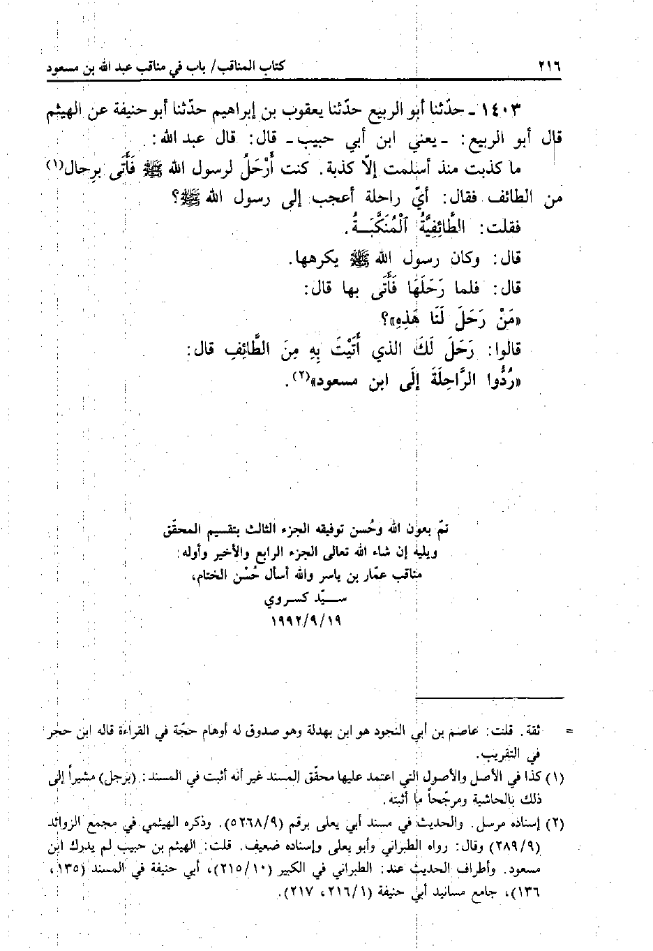 1403 - حَدَّثَنَا أَبُو الرَّبِيعِ، حَدَّثَنَا يَعْقُوبُ بْنُ إِبْرَاهِيمَ، حَدَّثَنَا أَبُو حَنِيفَةَ، عَنِ الْهَيْثَمِ قَالَ أَبُو الرَّبِيعِ: - يَعْنِي ابْنَ أَبِي حَبِيبٍ - قَالَ: قَالَ عَبْدُ اللَّهِ: مَا كَذَبْتُ مُنْذُ أَسْلَمْتُ إِلا كَذِبَةً؟ كُنْتُ أَرْحَلُ لِرَسُولِ اللَّهِ صَلَّى اللَّهُ عَلَيْهِ وَسَلَّمَ فَأَتَى بِرِحَالٍ مِنَ الطَّائِفِ فَقَالَ: أَيُّ رَاحِلَةٍ أَعْجَبُ إِلَى رَسُولِ اللَّهِ صَلَّى اللَّهُ عَلَيْهِ وَسَلَّمَ؟ فَقُلْتُ: الطَّائِفِيَّةُ الْمَكِّيَّةُ.