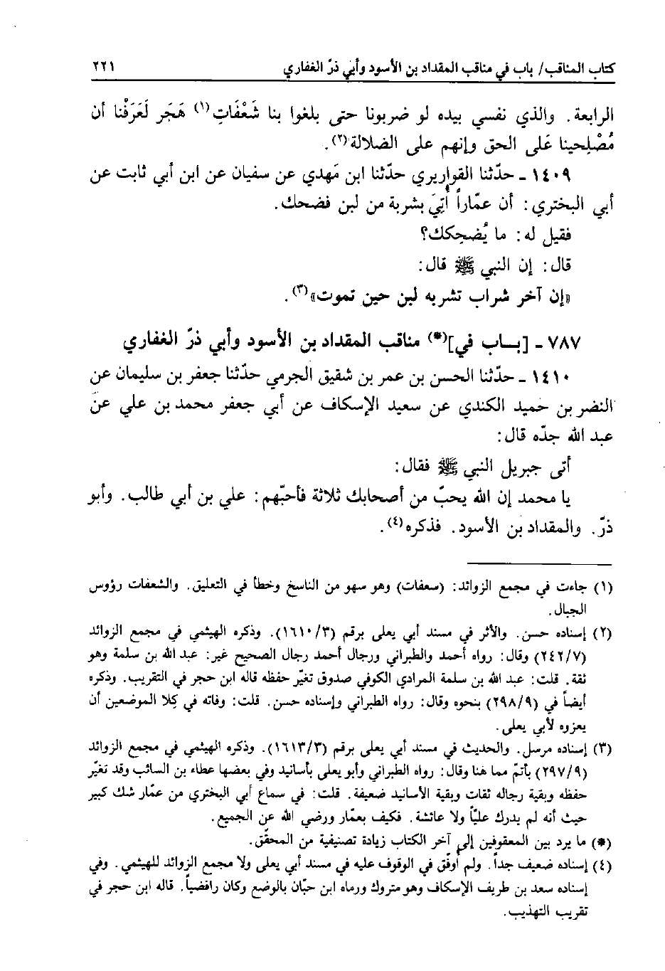 1410 - حَدَّثَنَا الْحَسَنُ بْنُ عُمَرَ بْنِ شَقِيقٍ الْجَرْمِيُّ، حَدَّثَنَا جَعْفَرُ بْنُ سُلَيْمَانَ، عَنِ النَّضْرِ بْنِ حُمَيْدٍ الْكِنْدِيِّ، عَنْ سَعِيدٍ الإِسْكَافِ، عَنْ أَبِي جَعْفَرٍ مُحَمَّدِ بْنِ عَلِيٍّ، عَنْ عَبْدِ اللَّهِ جَدِّهِ قَالَ: أَتَى جِبْرِيلُ النَّبِيَّ صَلَّى اللَّهُ عَلَيْهِ وَسَلَّمَ فَقَالَ: يَا مُحَمَّدُ إِنَّ اللَّهَ يُحِبُّ مِنْ أَصْحَابِكَ ثَلاثَةً فَأَحِبَّهُمْ: عَلِيُّ بْنُ أَبِي طَالِبٍ.