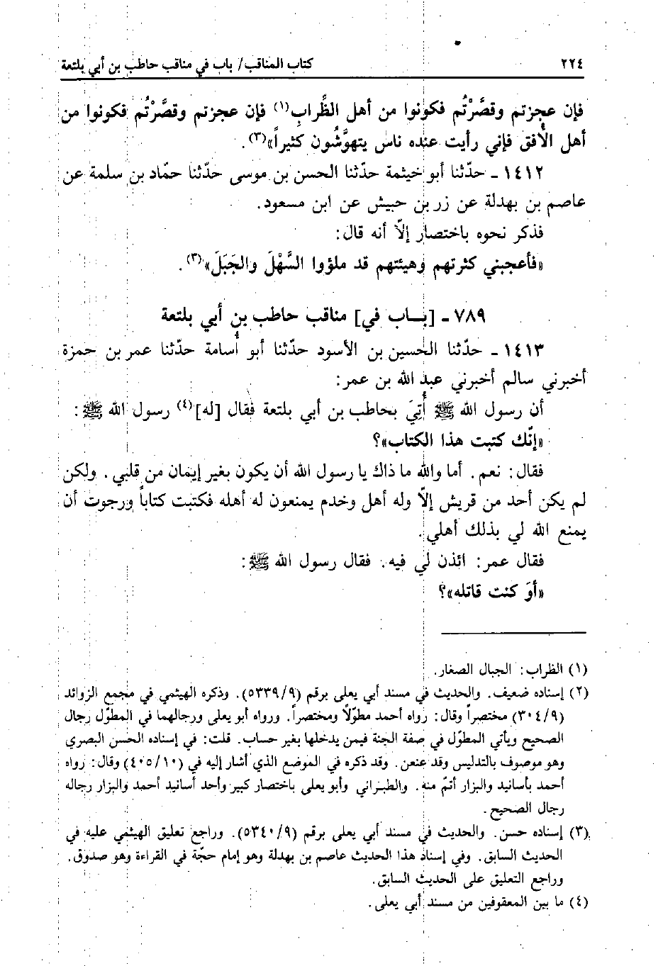 1413 - حَدَّثَنَا الْحُسَيْنُ بْنُ الأَسْوَدِ، حَدَّثَنَا أَبُو أُسَامَةَ، حَدَّثَنَا عُمَرُ بْنُ حَمْزَةَ، أَخْبَرَنِي سَالِمٌ، أَخْبَرَنِي عَبْدُ اللَّهِ بْنُ عُمَرَ: أَنَّ رَسُولَ اللَّهِ صَلَّى اللَّهُ عَلَيْهِ وَسَلَّمَ أُتِيَ بِحَاطِبِ بْنِ أَبِي بَلْتَعَةَ فَقَالَ لَهُ رَسُولُ اللَّهِ صَلَّى اللَّهُ عَلَيْهِ وَسَلَّمَ: «إِنَّكَ كَتَبْتَ هَذَا الْكِتَابَ» ؟ فَقَالَ: نَعَمْ.