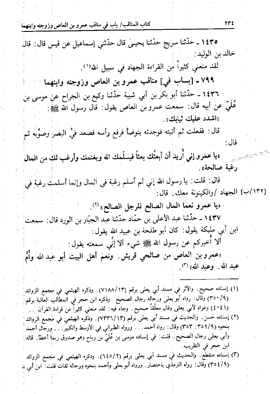 1437 - حَدَّثَنَا عَبْدُ الأَعْلَى بْنُ حَمَّادٍ، حَدَّثَنَا عَبْدُ الْجَبَّارِ بْنُ الْوَرْدِ قَالَ: سَمِعْتُ ابْنَ أَبِي مُلَيْكَةَ يَقُولُ: كَانَ أَبُو طَلْحَةَ بْنُ عُبَيْدِ اللَّهِ يَقُولُ: أَلا أُخْبِرُكَمْ عَنْ رَسُولِ اللَّهِ صَلَّى اللَّهُ عَلَيْهِ وَسَلَّمَ شَيْئًا أَلا إِنِّي سَمِعْتُهُ يَقُولُ: «عَمْرُو بْنُ الْعَاصِ مِنْ صَالِحِي قُرَيْشٍ.