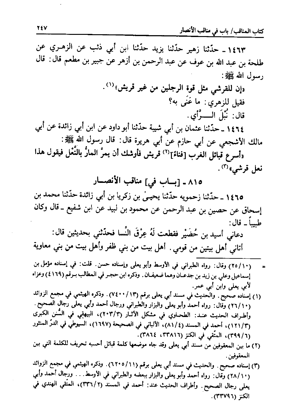 1465 - حَدَّثَنَا زَحْمَوَيْهِ، حَدَّثَنَا يَحْيَى بْنُ زَكَرِيَّا بْنِ أَبِي زَائِدَةَ، حَدَّثَنَا مُحَمَّدُ بْنُ إِسْحَاقَ، عَنْ حُصَيْنِ بْنِ عَبْدِ الرَّحْمَنِ، عَنْ مَحْمُودِ بْنِ لَبيدٍ، عَنِ ابْنِ شَفِيعٍ - قَالَ وَكَانَ طَبِيبًا - قَالَ: دَعَانِي أُسَيْدُ بْنُ حُضَيْرٍ فَقَطَعْتُ لَهُ عِرْقَ النِّسَا فَحَدَّثَنِي بِحَدِيثَيْنِ قَالَ: أَتَانِي أَهْلُ بَيْتَيْنِ مِنْ قَوْمِي.