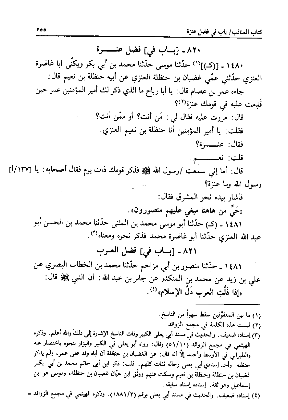 1481 - حَدَّثَنَا مَنْصُورُ بْنُ أَبِي مُزَاحِمٍ، حَدَّثَنَا مُحَمَّدُ بْنُ الْخَطَّابِ الْبَصْرِيُّ، عَنْ عَلِيِّ بْنِ زَيْدٍ، عَنْ مُحَمَّدِ بْنِ الْمُنْكَدِرِ، عَنْ جَابِرِ بْنِ عَبْدِ اللَّهِ: أَنَّ النَّبِيَّ صَلَّى اللَّهُ عَلَيْهِ وَسَلَّمَ قَالَ: «إِذَا ذَلَّتِ الْعَرَبُ ذَلَّ الإِسْلامُ» .