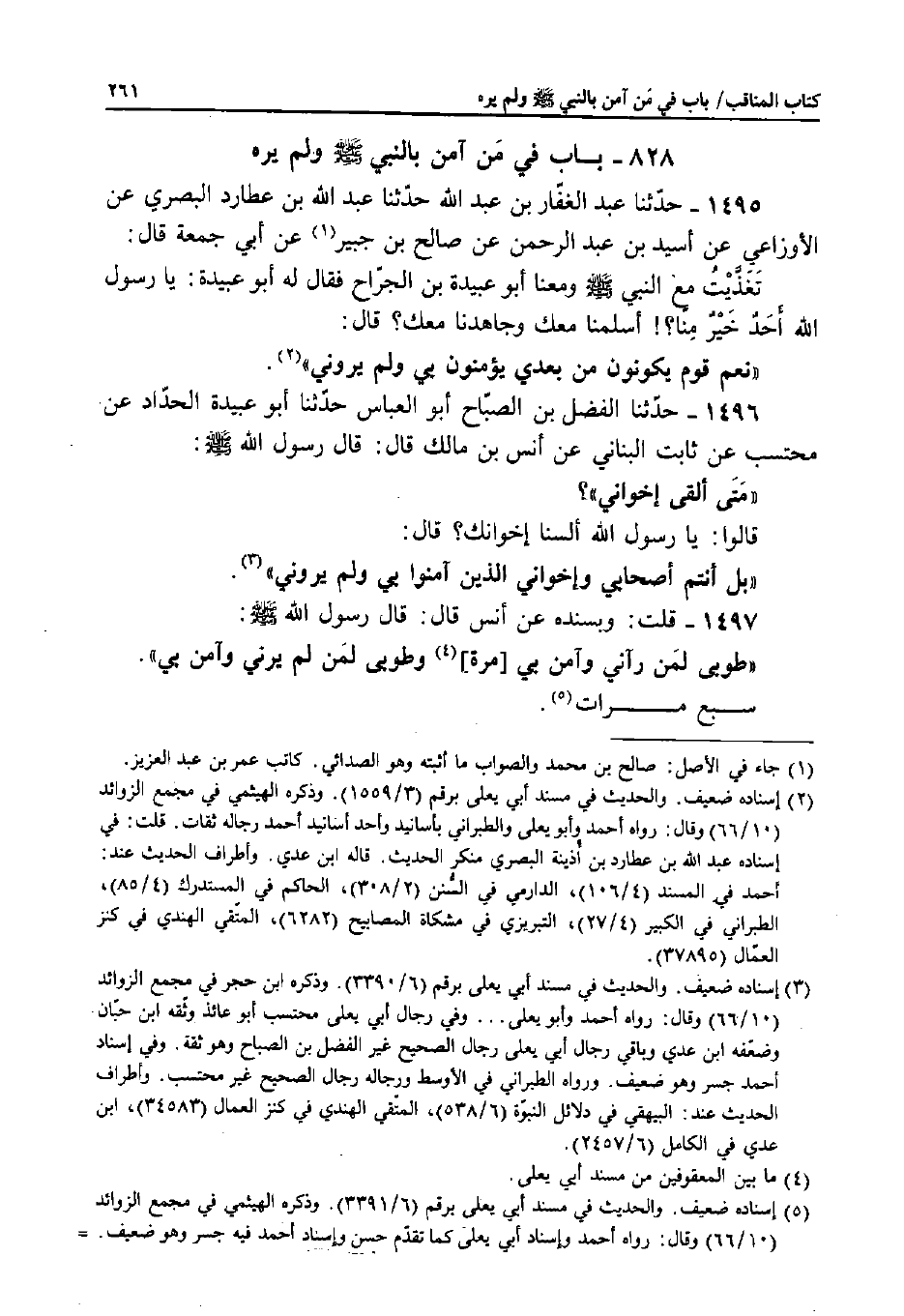 1497 - قُلْتُ: وَبِسَنَدِهِ عَنْ أَنَسٍ قَالَ: قَالَ رَسُولُ اللَّهِ صَلَّى اللَّهُ عَلَيْهِ وَسَلَّمَ: «طُوبَى لِمَنْ رَآنِي وَآمَنَ بِي مَرَّةً، وَطُوبَى لِمَنْ لَمْ يَرَنِي وَآمَنَ بِي» .