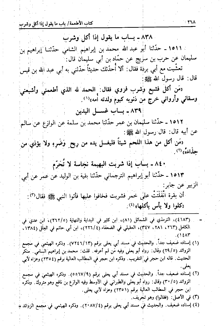 1511 - حَدَّثَنَا أَبُو عَبْدِ اللَّهِ مُحَمَّدُ بْنُ إِبْرَاهِيمَ الشَّامِيُّ، حَدَّثَنَا إِبْرَاهِيمُ بْنُ سُلَيْمَانَ، عَنْ حَرْبِ بْنِ سُرَيْجٍ، عَنْ حَمَّادِ بْنِ أَبِي سُلَيْمَانَ قَالَ: تَعَشَّيْتُ مَعَ أَبِي بُرْدَةَ فَقَالَ: أَلا أُحَدِّثُكَ حَدِيثًا حَدَّثَنِي بِهِ أَبِي عَبْدُ اللَّهِ بْنُ قَيْسٍ قَالَ: قَالَ رَسُولُ اللَّهِ صَلَّى اللَّهُ عَلَيْهِ وَسَلَّمَ: " مَنْ أَكَلَ فَشَبِعَ وَشَرِبَ فَرُوِيَ؛ فَقَالَ: الْحَمْدُ لِلَّهِ الَّذِي أَطْعَمَنِي وَأَشْبَعَنِي وَسَقَانِي وَأَرْوَانِي خَرَجَ مِنْ ذُنُوبِهِ كَيَوْمِ وَلَدَتْهُ أُمُّهُ ".