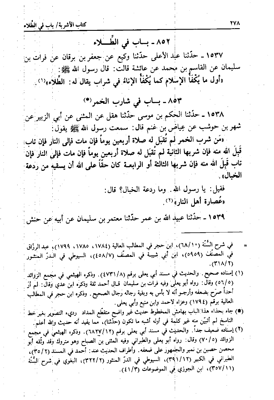 1538 - حَدَّثَنَا الْحَكَمُ بْنُ مُوسَى، حَدَّثَنَا هَقْلٌ، عَنِ الْمُثَنَّى، عَنْ أَبِي الزُّبَيْرِ، عَنْ شَهْرِ بْنِ حَوْشَبٍ، عَنْ عِيَاضِ بْنِ غَنَمٍ قَالَ: سَمِعْتُ رَسُولَ اللَّهِ صَلَّى اللَّهُ عَلَيْهِ وَسَلَّمَ يَقُولُ: «مَنْ شَرِبَ الْخَمْرَ لَمْ تُقْبَلْ لَهُ صَلاةٌ أَرْبَعِينَ يَوْمًا فَإِنْ مَاتَ فَإِلَى النَّارِ؛ فَإِنْ تَابَ قَبِلَ اللَّهُ مِنْهُ فَإِنْ شَرِبَهَا الثَّانِيَةَ لَمْ تُقْبَلْ لَهُ صَلاةٌ أَرْبَعِينَ يَوْمًا؛ فَإِنْ مَاتَ فَإِلَى النَّارِ فَإِنْ تَابَ قَبِلَ اللَّهُ مِنْهُ؛ فَإِنْ شَرِبَهَا الثَّالِثَةَ أَوِ الرَّابِعَةَ كَانَ حَقًّا عَلَى اللَّهِ أَنْ يَسْقِيهِ مِنْ رَدْعَةِ الْخَبَالِ» .