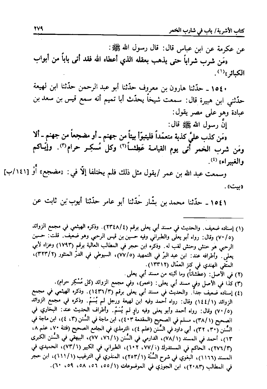 1540 - حَدَّثَنَا هَارُونُ بْنُ مَعْرُوفٍ، حَدَّثَنَا أَبُو عَبْدِ الرَّحْمَنِ، حَدَّثَنَا ابْنُ لَهِيعَةَ، حَدَّثَنِي ابْنُ هُبَيْرَةَ قَالَ: سَمِعْتُ شَيْخًا يُحَدِّثُ أَبَا تَمِيمٍ أَنَّهُ سَمِعَ قَيْسَ بْنَ سَعْدِ بْنِ عُبَادَةَ وَهُوَ عَلَى مِصْرَ يَقُولُ: إِنَّ رَسُولَ اللَّهِ صَلَّى اللَّهُ عَلَيْهِ وَسَلَّمَ قَالَ: «مَنْ كَذِبَ عَلَيَّ كَذِبَةً مُتَعَمِّدًا فَلْيَتَبَوَّأْ بَيْتًا مِنْ جَهَنَّمَ - أَوْ مَضْجَعًا مِنْ جَهَنَّمَ - أَلا وَمَنْ شَرِبَ الْخَمْرَ أَتَى يَوْمَ الْقِيَامَةِ عَطِشًا وَكُلُّ مُسْكِرٍ حَرَامٌ.