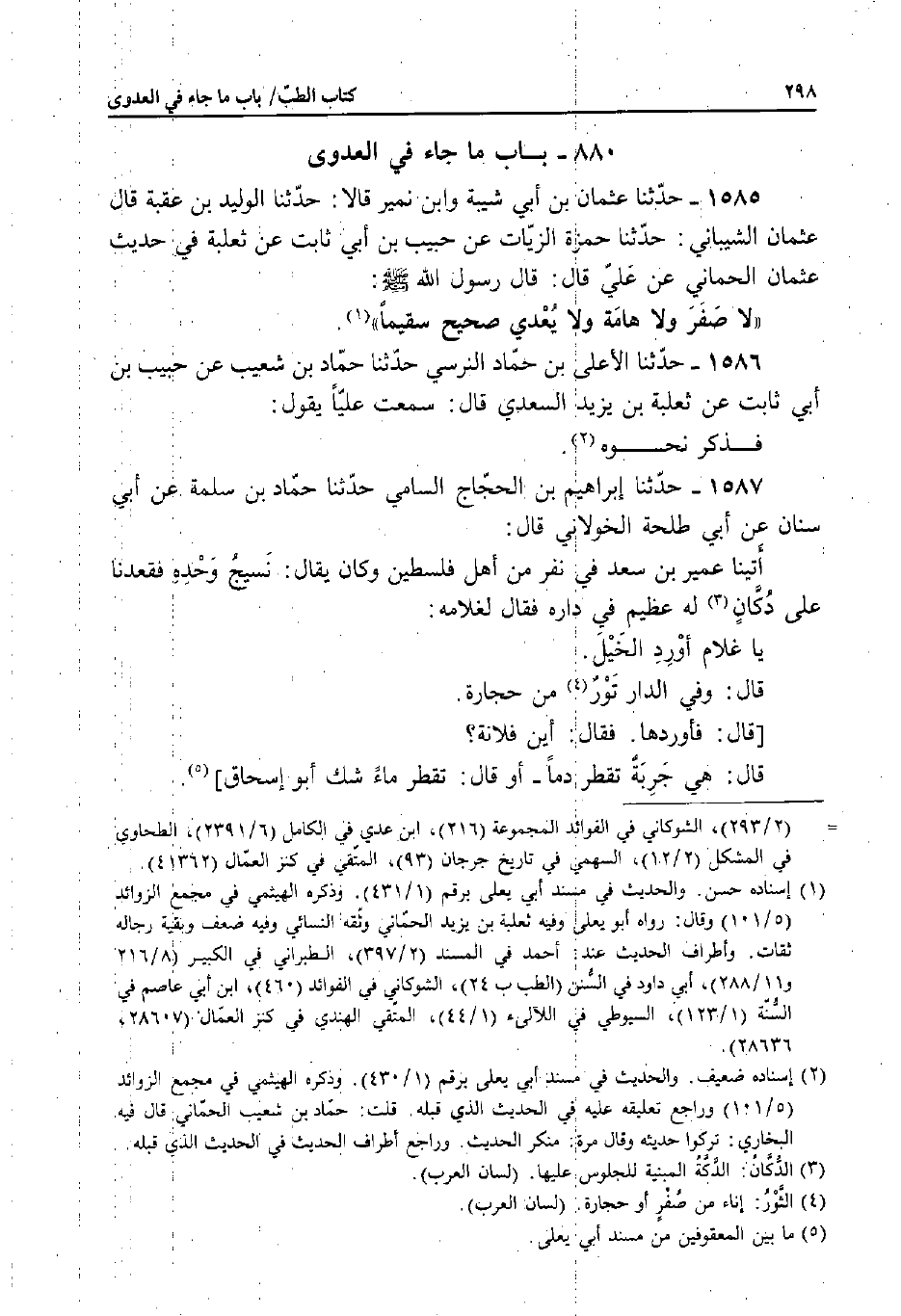 1585 - حَدَّثَنَا عُثْمَانُ بْنُ أَبِي شَيْبَةَ وَابْنُ نُمَيْرٍ قَالا: حَدَّثَنَا الْوَلِيدُ بْنُ عُقْبَةَ قَالَ عُثْمَانُ الشَّيْبَانِيُّ: حَدَّثَنَا حَمْزَةُ الزَّيَّاتُ، عَنْ حَبِيبِ بْنِ أَبِي ثَابِتٍ، عَنْ ثَعْلَبَةَ فِي حَدِيثِ عُثْمَانَ الْحِمَّانِيِّ، عَنْ عَلِيٍّ قَالَ: قَالَ رَسُولُ اللَّهِ صَلَّى اللَّهُ عَلَيْهِ وَسَلَّمَ: «لا صَفَرَ وَلا هَامَّةَ وَلا يُعْدِي سَقِيمٌ صَحِيحًا» .