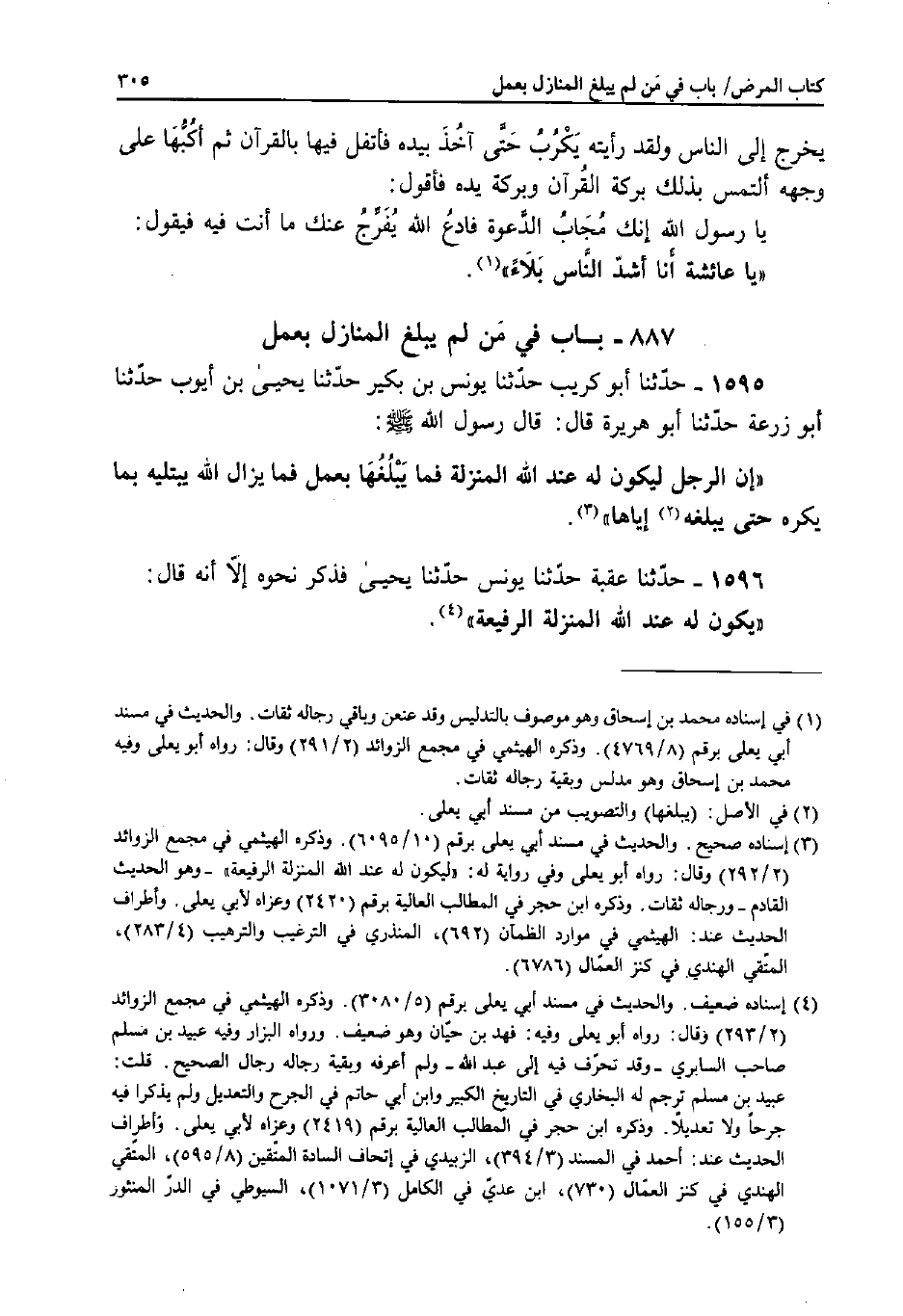 1595 - حَدَّثَنَا أَبُو كُرَيْبٍ، حَدَّثَنَا يُونُسُ بْنُ بُكَيْرٍ، حَدَّثَنَا يَحْيَى بْنُ أَيُّوبَ، حَدَّثَنَا أَبُو زَرْعَةَ، حَدَّثَنَا أَبُو هُرَيْرَةَ قَالَ: قَالَ رَسُولُ اللَّهِ صَلَّى اللَّهُ عَلَيْهِ وَسَلَّمَ: «إِنَّ الرَّجُلَ لَيَكُونُ لَهُ عِنْدَ اللَّهِ الْمَنْزِلَةُ فَمَا يَبْلُغُهَا بِعَمَلٍ؛ فَمَا يَزَالُ اللَّهُ يَبْتَلِيهِ بِمَا يَكْرَهُ حَتَّى يُبَلِّغَهُ إِيَّاهَا» .