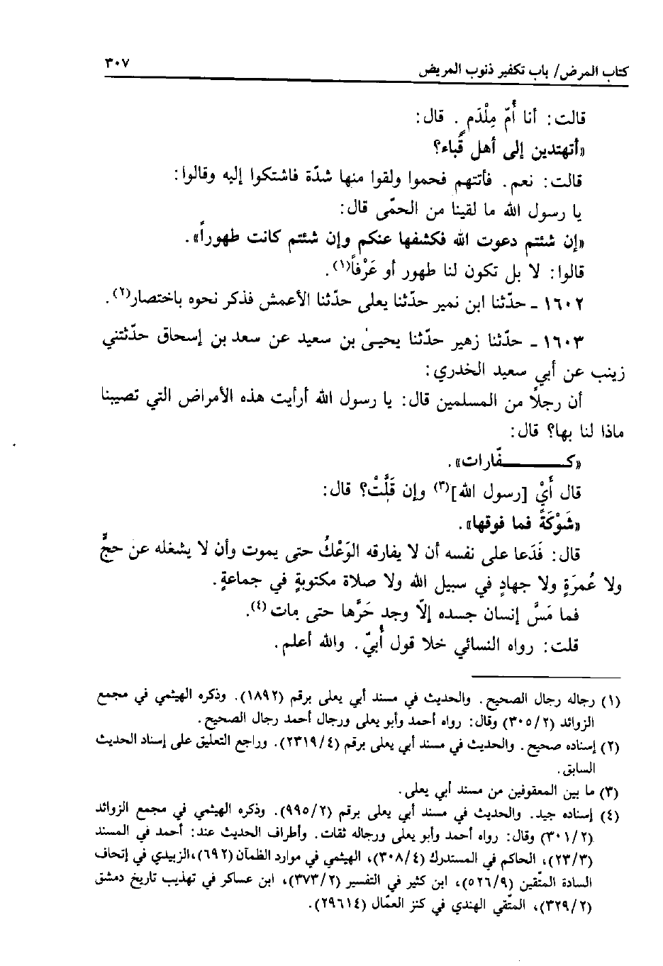 1603 - حَدَّثَنَا زُهَيْرٌ، حَدَّثَنَا يَحْيَى بْنُ سَعِيدٍ، عَنْ سَعْدِ بْنِ إِسْحَاقَ، حَدَّثَتْنِي زَيْنَبُ، عَنْ أَبِي سَعِيدٍ الْخُدْرِيِّ: أَنَّ رَجُلا مِنَ الْمُسْلِمِينَ قَالَ: يَا رَسُولَ اللَّهِ؛ أَرَأَيْتَ هَذِهِ الأَمْرَاضَ الَّتِي تُصِيبُنَا مَاذَا لَنَا بِهَا؟ قَالَ: «كَفَّارَاتٌ» .
