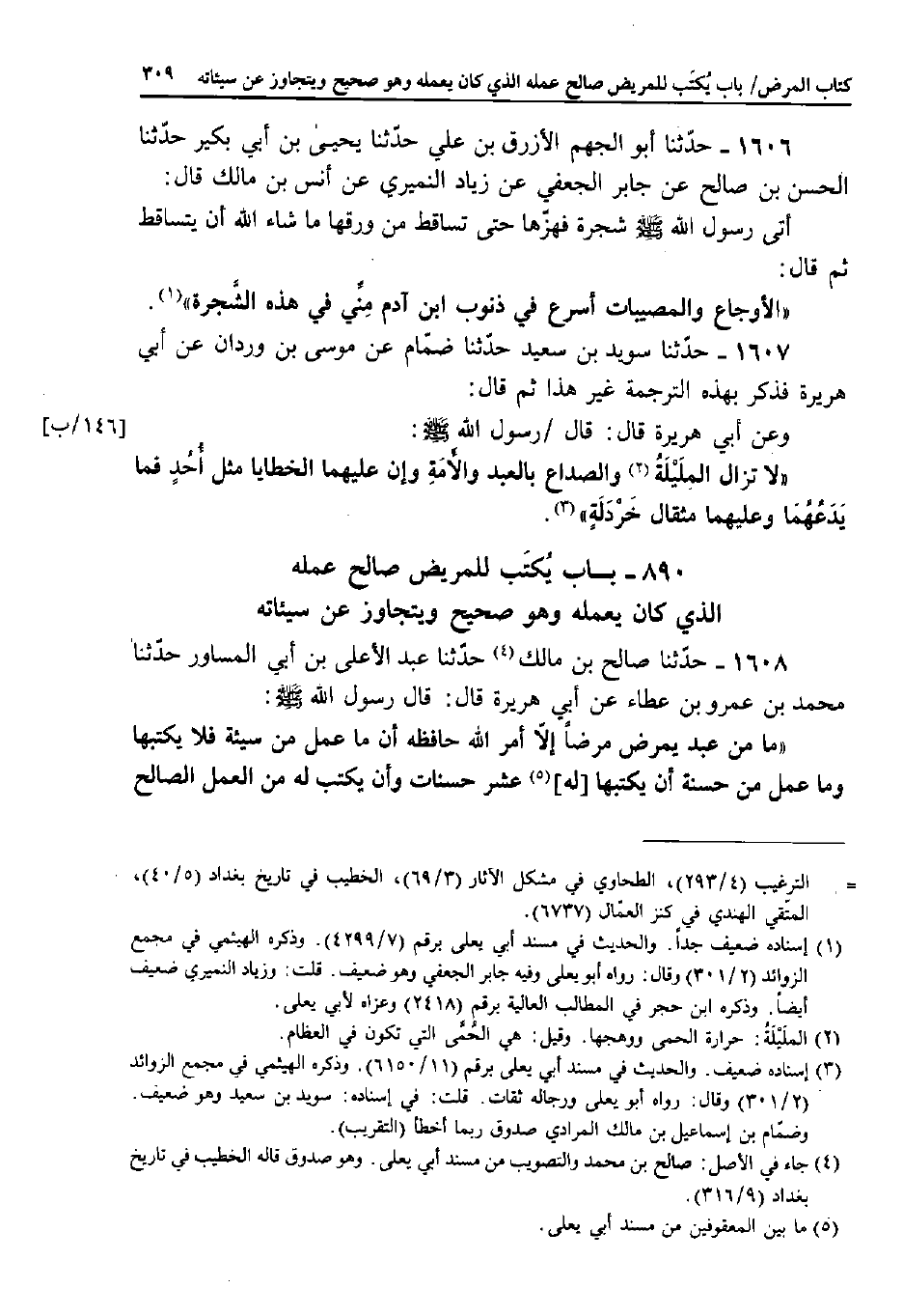 1608 - حَدَّثَنَا صَالِحُ بْنُ مَالِكٍ، حَدَّثَنَا عَبْدُ الأَعْلَى بْنُ أَبِي الْمُسَاوِرِ، حَدَّثَنَا مُحَمَّدُ بْنُ عَمْرِو بْنِ عَطَاءٍ، عَنْ أَبِي هُرَيْرَةَ قَالَ: قَالَ رَسُولُ اللَّهِ صَلَّى اللَّهُ عَلَيْهِ وَسَلَّمَ: «مَا مِنْ عَبْدٍ يَمْرَضُ مَرَضًا إِلا أَمَرَ اللَّهُ حَافِظَهُ أَنَّ مَا عَمِلَ مِنْ سَيِّئَةِ فَلا يَكْتُبُهَا وَمَا عَمِلَ مِنْ حَسَنَةٍ أَنْ يَكْتُبَهَا لَهُ عَشْرَ حَسَنَاتٍ وَأَنْ يَكْتُبَ لَهُ مِنَ الْعَمَلِ الصَّالِحِ