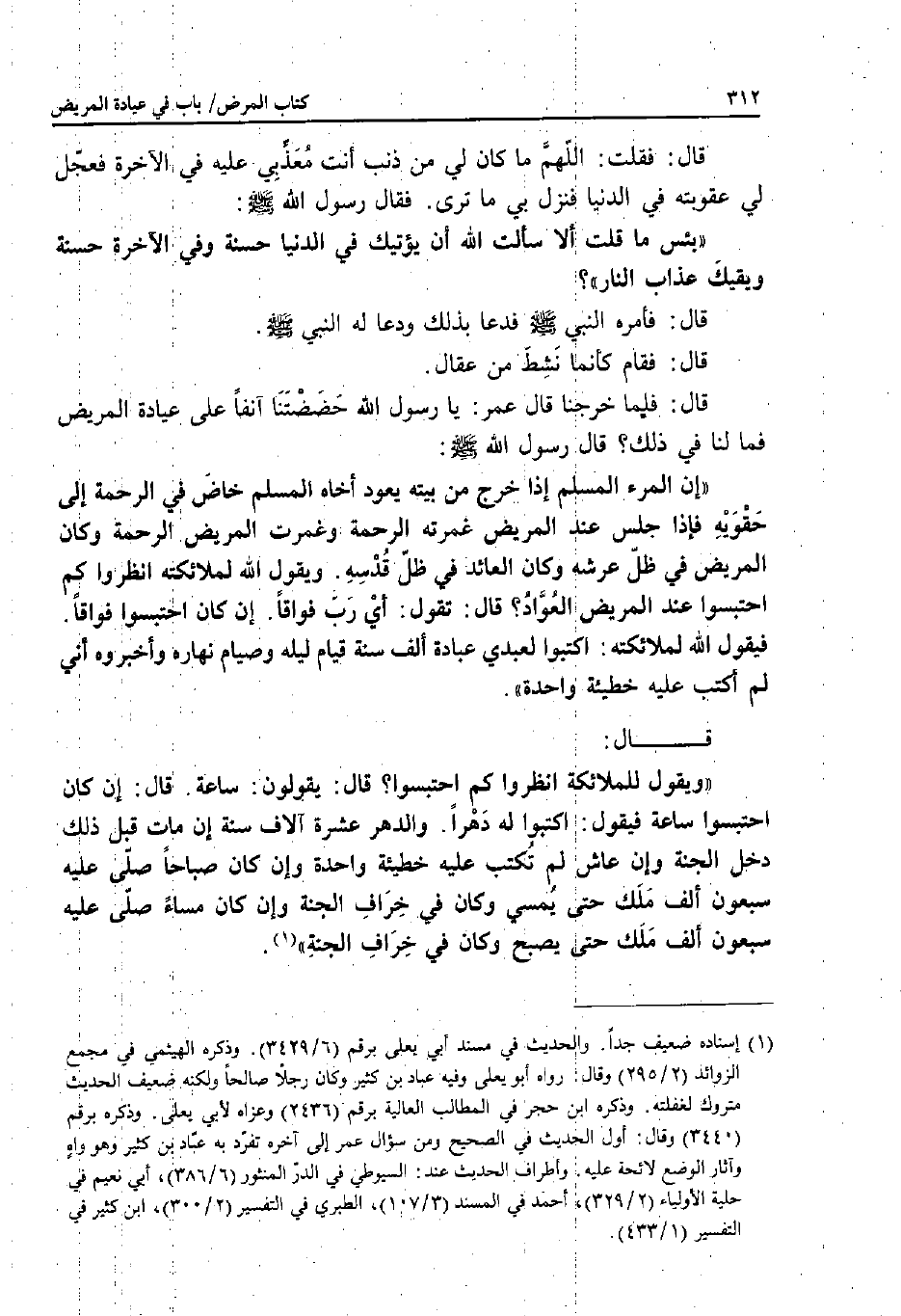 وَيَقُولُ اللَّهُ لِمَلائِكَتِهِ: انْظُرُوا كَمِ احْتَبَسُوا عِنْدَ الْمَرِيضِ الَعُوَّادُ؟ قَالَ: تَقُولُ: أَيْ رَبِّ فَوَاقًا.