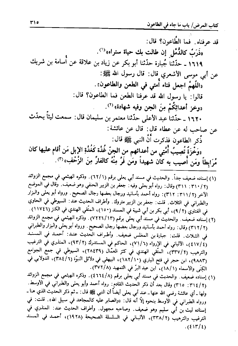 1619 - حَدَّثَنَا جُبَارَةُ، حَدَّثَنَا أَبُو بَكْرٍ، عَنْ زِيَادِ بْنِ عِلاقَةَ، عَنْ أُسَامَةَ بْنِ شَرِيكٍ، عَنْ أَبِي مُوسَى الأَشْعَرِيِّ قَالَ: قَالَ رَسُولُ اللَّهِ صَلَّى اللَّهُ عَلَيْهِ وَسَلَّمَ: «اللَّهُمَّ اجْعَلْ فَنَاءَ أُمَّتِي فِي الطَّعْنِ وَالطَّاعُونِ» .