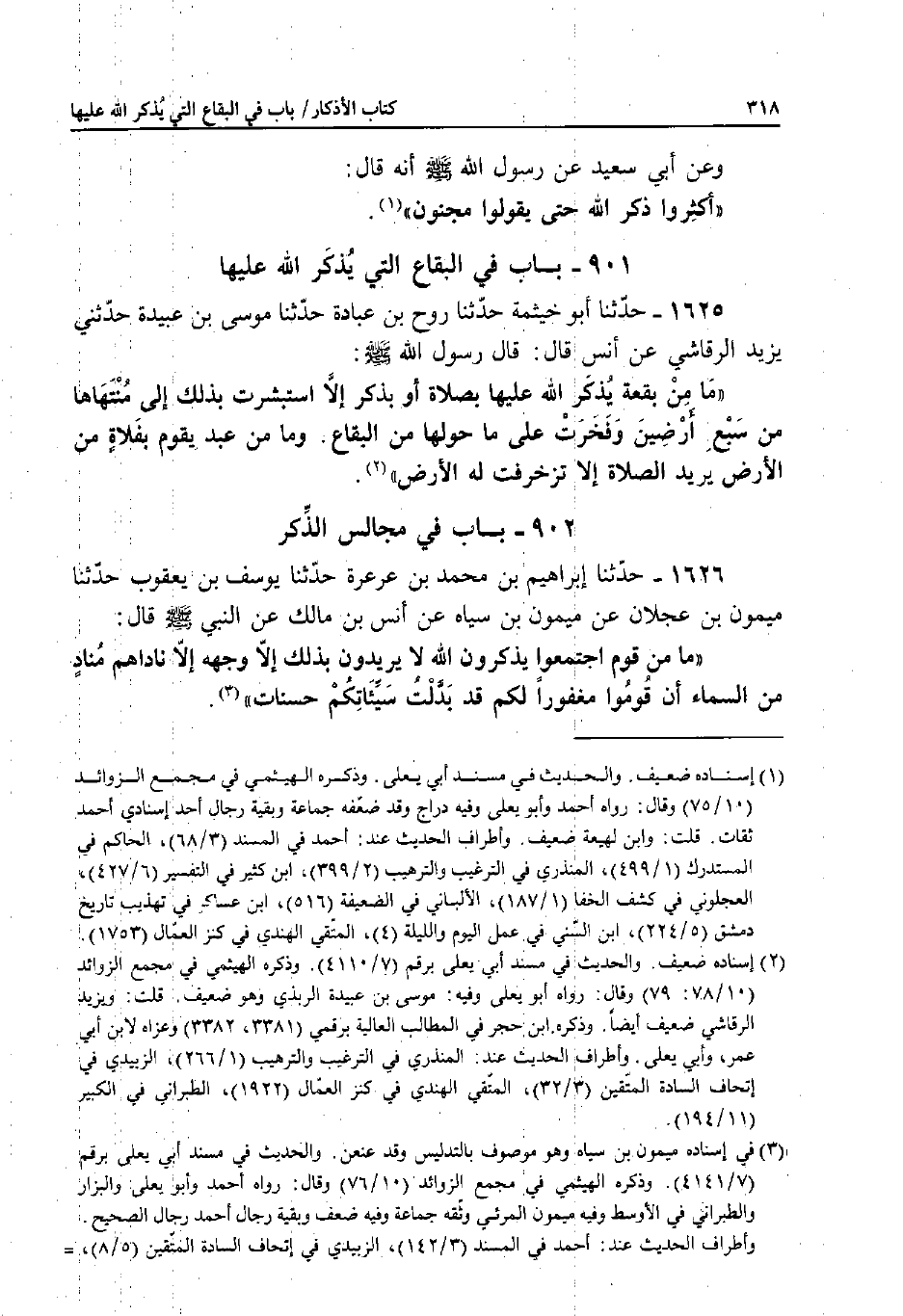 1625 - حَدَّثَنَا أَبُو خَيْثَمَةَ، حَدَّثَنَا رُوحُ بْنُ عُبَادَةَ، حَدَّثَنَا مُوسَى بْنُ عُبَيْدَةَ، حَدَّثَنِي يَزِيدُ الرَّقَاشِيُّ، عَنْ أَنَسٍ قَالَ: قَالَ رَسُولُ اللَّهِ صَلَّى اللَّهُ عَلَيْهِ وَسَلَّمَ: «مَا مِنْ بُقْعَةٍ يُذْكَرُ اللَّهُ عَلَيْهَا بِصَلاةٍ أَوْ بِذِكْرٍ، إِْلا اسْتَبْشَرَتْ بِذَلِكَ إِلَى مُنْتَهَاهَا مِنْ سَبْعِ أَرَضِينَ وَفَخَرَتْ عَلَى مَا حَوْلَهَا مِنَ الْبِقَاعِ.