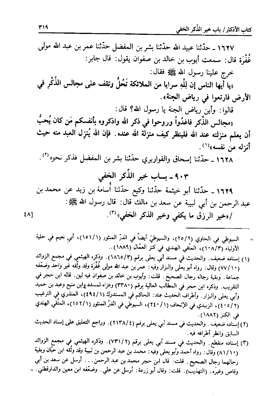 1629 - حَدَّثَنَا أَبُو خَيْثَمَةَ، حَدَّثَنَا وَكِيعٌ، حَدَّثَنَا أُسَامَةُ بْنُ زَيْدٍ، عَنْ مُحَمَّدِ بْنِ عَبْدِ الرَّحْمَنِ بْنِ أَبِي لَبِيبَةَ، عَنْ سَعْدِ بْنِ مَالِكٍ قَالَ: قَالَ رَسُولُ اللَّهِ صَلَّى اللَّهُ عَلَيْهِ وَسَلَّمَ: «خَيْرُ الرِّزْقِ مَا يَكْفِي وَخَيْرُ الذِّكْرِ الْخَفِيُّ»
