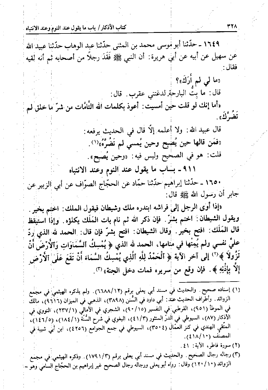 وَقَالَ الشَّيْطَانُ: افْتَحْ بِشَرٍّ؛ فَإِنْ قَالَ: الْحَمْدُ لِلَّهِ الَّذِي رَدَّ عَلَيَّ نَفْسِي وَلَمْ يُمِتْهَا فِي مَنَامِهَا، الْحَمْدُ لِلَّهِ الَّذِي {يُمْسِكُ السَّمَوَاتِ وَالأَرْضَ أَنْ تَزُولا} [فاطر: 41] إِلَى آخِرِ الآيَةِ الْحَمْدُ لِلَّهِ الَّذِي {وَيُمْسِكُ السَّمَاءَ أَنْ تَقَعَ عَلَى الأَرْضِ إِلا بِإِذْنِهِ} [الحج: 65] .