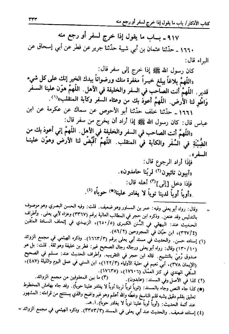 فَإِذَا أَرَادَ الرُّجُوعَ قَالَ: «آيِبُونَ تَائِبُونَ لِرَبِّنَا حَامِدُونَ» فَإِذَا دَخَلَ إِلَى أَهْلِهِ قَالَ: «أَوْبًا أَوْبًا لَدَيْنَا تَوْبًا لا يُغَادِرُ عَلَيْنَا حَوْبًا» .