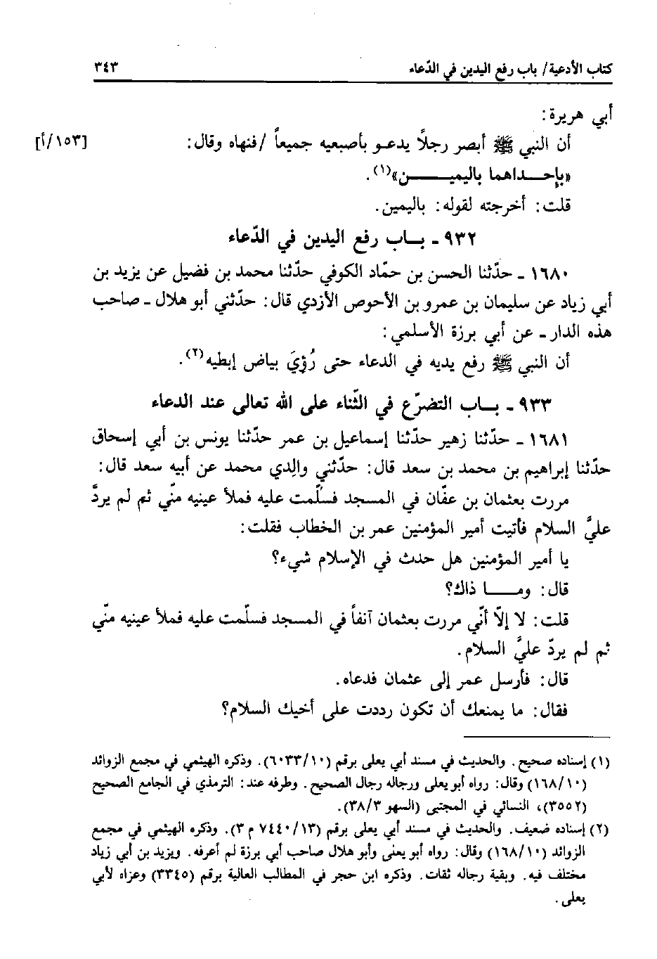 أَبِي هُرَيْرَةَ: أَنَّ النَّبِيَّ صَلَّى اللَّهُ عَلَيْهِ وَسَلَّمَ أَبْصَرَ رَجُلا يَدْعُو بِأَصْبُعَيْهِ جَمِيعًا فَنَهَاهُ وَقَالَ: «بِإِحْدَاهُمَا بِالْيَمِينِ» قُلْتُ: أَخْرَجْتُهُ لِقَوْلِهِ: بِالْيَمِينِ.