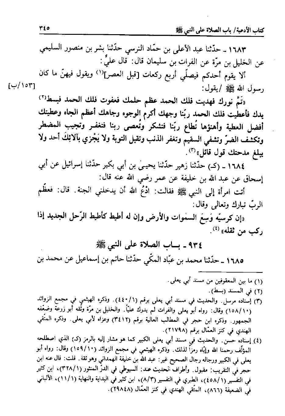 1683 - حَدَّثَنَا عَبْدُ الأَعْلَى بْنُ حَمَّادٍ النَّرْسِيُّ، حَدَّثَنَا بِشْرُ بْنُ مَنْصُورٍ السُّلَيْمِيُّ، عَنِ الْخَلِيلِ بْنِ مُرَّةَ، عَنِ الْفُرَاتِ بْنِ سُلَيْمَانَ قَالَ: قَالَ عَلِيٌّ: أَلا يَقُومُ أَحَدُكُمْ فَيُصَلِّي أَرْبَعَ رَكَعَاتٍ قَبْلَ الْعَصْرِ وَيَقُولُ فِيهِنَّ مَا كَانَ رَسُولُ اللَّهِ صَلَّى اللَّهُ عَلَيْهِ وَسَلَّمَ يَقُولُ: «تَمَّ نُورُكَ فَهَدَيْتَ فَلَكَ الْحَمْدُ، عَظُمَ حِلْمُكَ فَعَفَوْتَ فَلَكَ الْحَمْدُ، فَبَسَطْتَ يَدَكَ فَأَعْطَيْتَ فَلَكَ الْحَمْدُ.