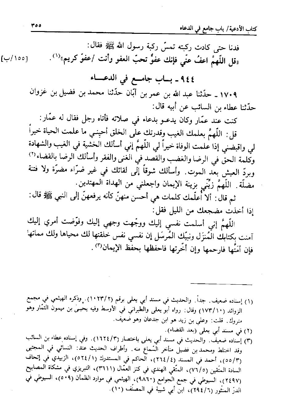 1709 - حَدَّثَنَا عَبْدُ اللَّهِ بْنُ عُمَرَ بْنِ أَبَانَ، حَدَّثَنَا مُحَمَّدُ بْنُ فُضَيْلِ بْنِ غَزْوَانَ، حَدَّثَنَا عَطَاءُ بْنُ السَّائِبِ، عَنْ أَبِيهِ قَالَ: كُنْتُ عِنْدَ عَمَّارٍ وَكَانَ يَدْعُو بِدُعَاءٍ فِي صَلاتِهِ فَأَتَاهُ رَجُلٌ فَقَالَ لَهُ عَمَّارٌ: قُلِ: اللَّهُمَّ بِعِلْمِكَ الْغَيْبَ وَقُدْرَتِكَ عَلَى الْخَلْقِ أَحْيِنِي مَا عَلِمْتَ الْحَيَاةَ خَيْرًا لِي وَاقْبِضْنِي إِذَا عَلِمْتَ الْوَفَاةَ خَيْرًا لِي.