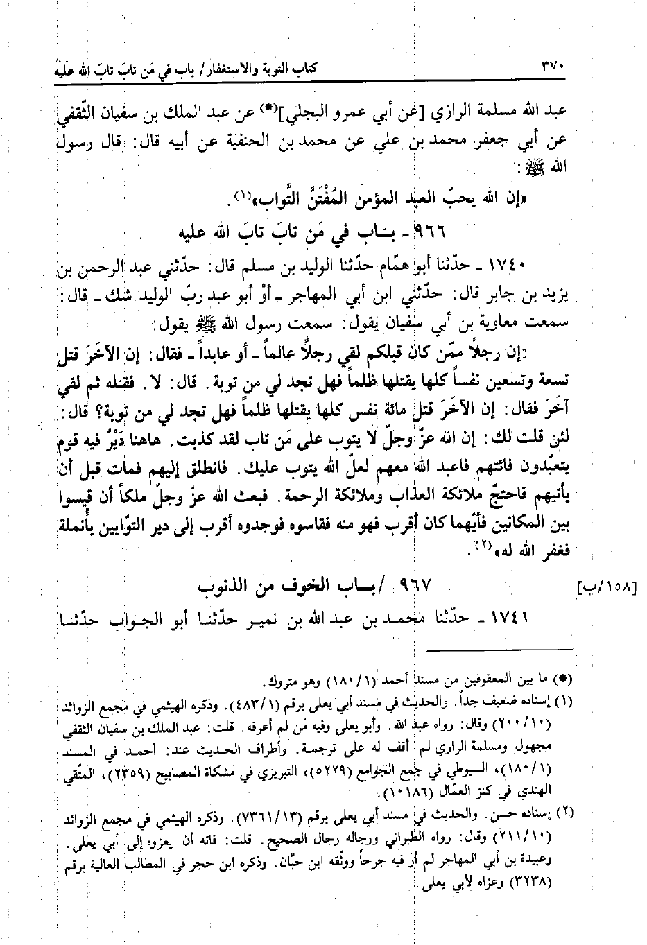 عَبْدِ اللَّهِ مَسْلَمَةُ الرَّازِيُّ، عَنْ أَبِي عَمْرٍو الْبَجَلِيِّ، عَنْ عَبْدِ الْمَلِكِ بْنِ سُفْيَانَ الثَّقَفِيِّ، عَنْ أَبِي جَعْفَرٍ مُحَمَّدِ بْنِ عَلِيٍّ، عَنْ مُحَمَّدِ بْنِ الْحَنَفِيَّةِ، عَنْ أَبِيهِ قَالَ: قَالَ رَسُولُ اللَّهِ صَلَّى اللَّهُ عَلَيْهِ وَسَلَّمَ: «إِنَّ اللَّهَ يُحِبُّ الْعَبْدَ الْمُؤْمِنَ الْمُفَتَّنَ التَّوَّابَ» .