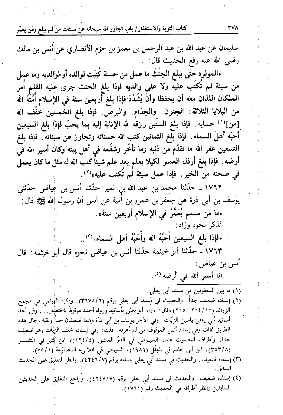 1762 - حَدَّثَنَا مُحَمَّدُ بْنُ عَبْدِ اللَّهِ بْنِ نُمَيْرٍ، حَدَّثَنَا أَنَسُ بْنُ عِيَاضٍ، حَدَّثَنِي يُوسُفُ بْنُ أَبِي ذَرَّةَ، عَنْ جَعْفَرِ بْنِ عَمْرِو بْنِ أُمَيَّةَ، عَنْ أَنَسٍ أَنَّ رَسُولَ اللَّهِ صَلَّى اللَّهُ عَلَيْهِ وَسَلَّمَ قَالَ: «مَا مِنْ مُسْلِمٍ يُعَمِّرُ فِي الإِسْلامِ أَرْبَعِينَ سَنَةً» .