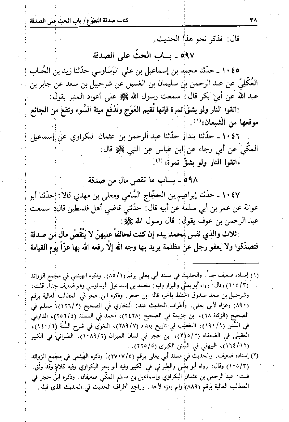 1045 - حَدَّثَنَا مُحَمَّدُ بْنُ إِسْمَاعِيلَ بْنِ عَلِيٍّ الْوَسَاوِسِيُّ، حَدَّثَنَا زَيْدُ بْنُ الْخَبَّابِ الْعُكْلِيُّ، عَنْ عَبْدِ الرَّحْمَنِ بْنِ سُلَيْمَانَ بْنِ الْغَسِيلِ، عَنْ شُرَحْبِيلَ بْنِ سَعْدٍ، عَنْ جَابِرِ بْنِ عَبْدِ اللَّهِ، عَنِ أَبِي بَكْرٍ قَالَ: سَمِعْتُ رَسُولَ اللَّهِ صَلَّى اللَّهُ عَلَيْهِ وَسَلَّمَ عَلَى أَعْوَادِ الْمِنْبَرِ يَقُولُ: «اتَّقُوا النَّارَ وَلَوْ بِشِقِّ تَمْرَةٍ فَإِنَّهَا تُقِيمُ الْعَوَجَ وَتَدْفَعُ مَيْتَةَ السُّوءِ وَتَقَعُ مِنَ الْجَائِعِ مَوْقِعَهَا مِنَ الشَّبْعَانِ» .