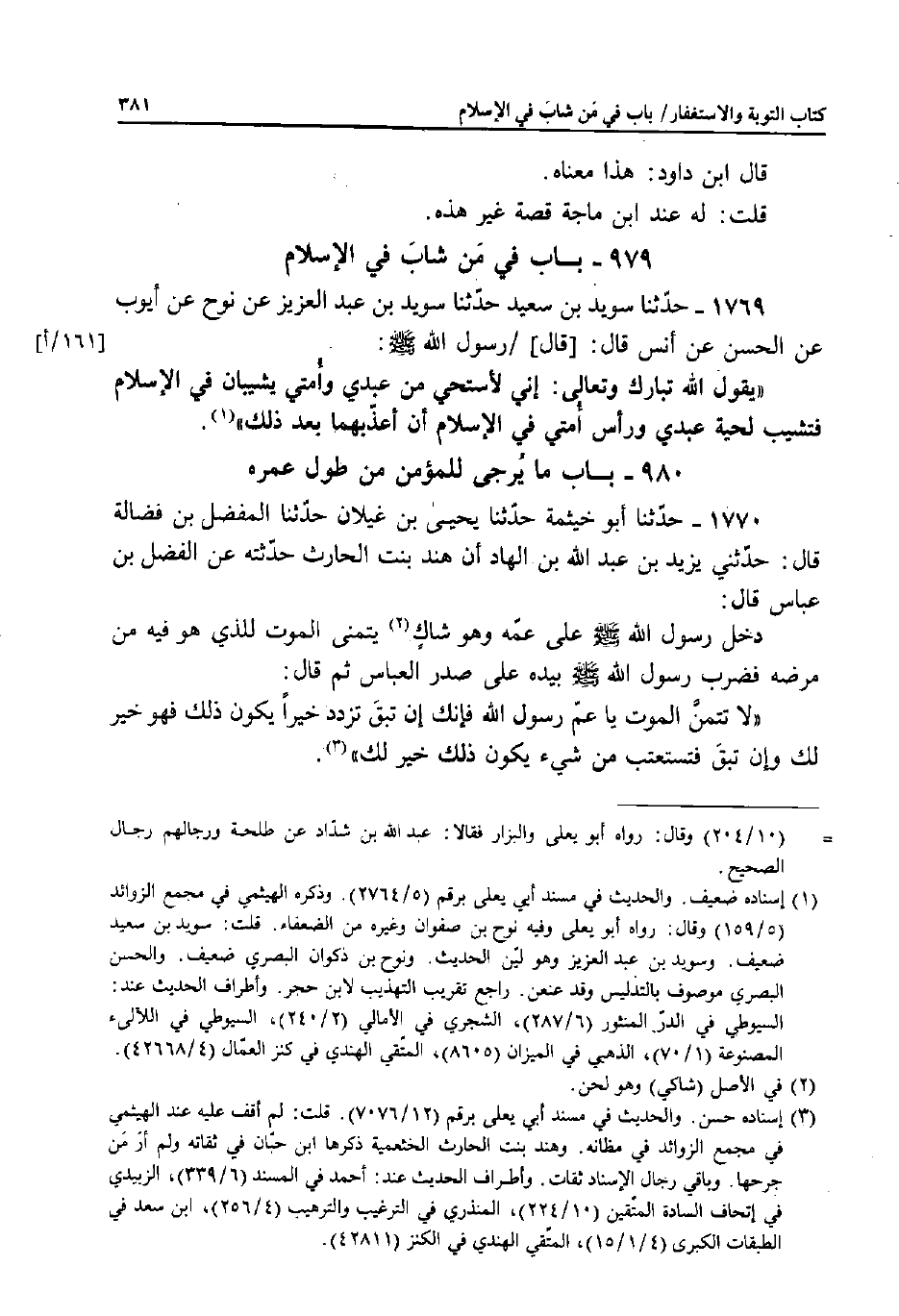 1770 - حَدَّثَنَا أَبُو خَيْثَمَةَ، حَدَّثَنَا يَحْيَى بْنُ غَيْلانَ، حَدَّثَنَا الْمُفَضَّلُ بْنُ فَضَالَةَ قَالَ: حَدَّثَنِي يَزِيدُ بْنُ عَبْدِ اللَّهِ بْنِ الْهَادِ أَنَّ هِنْدَ بِنْتَ الْحَارِثِ حَدَّثَتْهُ، عَنِ الْفَضْلِ بْنِ عَبَّاسٍ قَالَ: دَخَلَ رَسُولُ اللَّهِ صَلَّى اللَّهُ عَلَيْهِ وَسَلَّمَ عَلَى عَمِّهِ وَهُوَ شَاكٍ يَتَمَنَّى الْمَوْتُ لِلَّذِي هُوَ فِيهِ مِنْ مَرَضِهِ فَضَرَبَ رَسُولُ اللَّهِ صَلَّى اللَّهُ عَلَيْهِ وَسَلَّمَ بِيَدِهِ عَلَى صَدْرِ الْعَبَّاسِ ثُمَّ قَالَ: «لا تَتَمَنَّ الْمَوْتَ يَا عَمَّ رَسُولِ اللَّهِ، فَإِنَّكَ إِنْ تَبْقَ تَزْدَدْ خَيْرًا يَكُونُ ذَلِكَ فَهُوَ خَيْرٌ لَكَ وَإِنْ تَبْقَ فَتَسْتَعْتِبْ مِنْ شَيْءٍ يَكُونُ ذَلِكَ خَيْرًا لَكَ» .